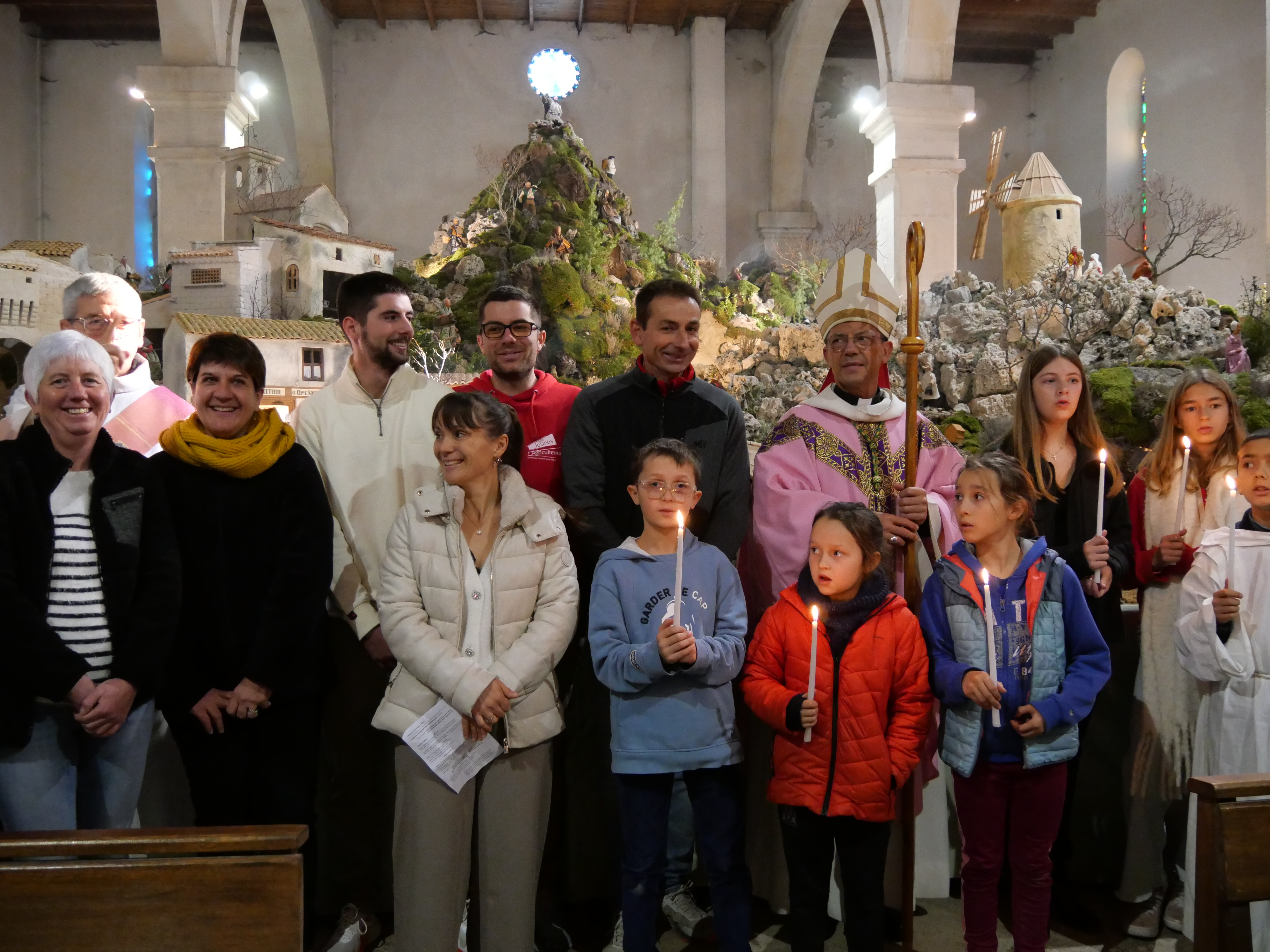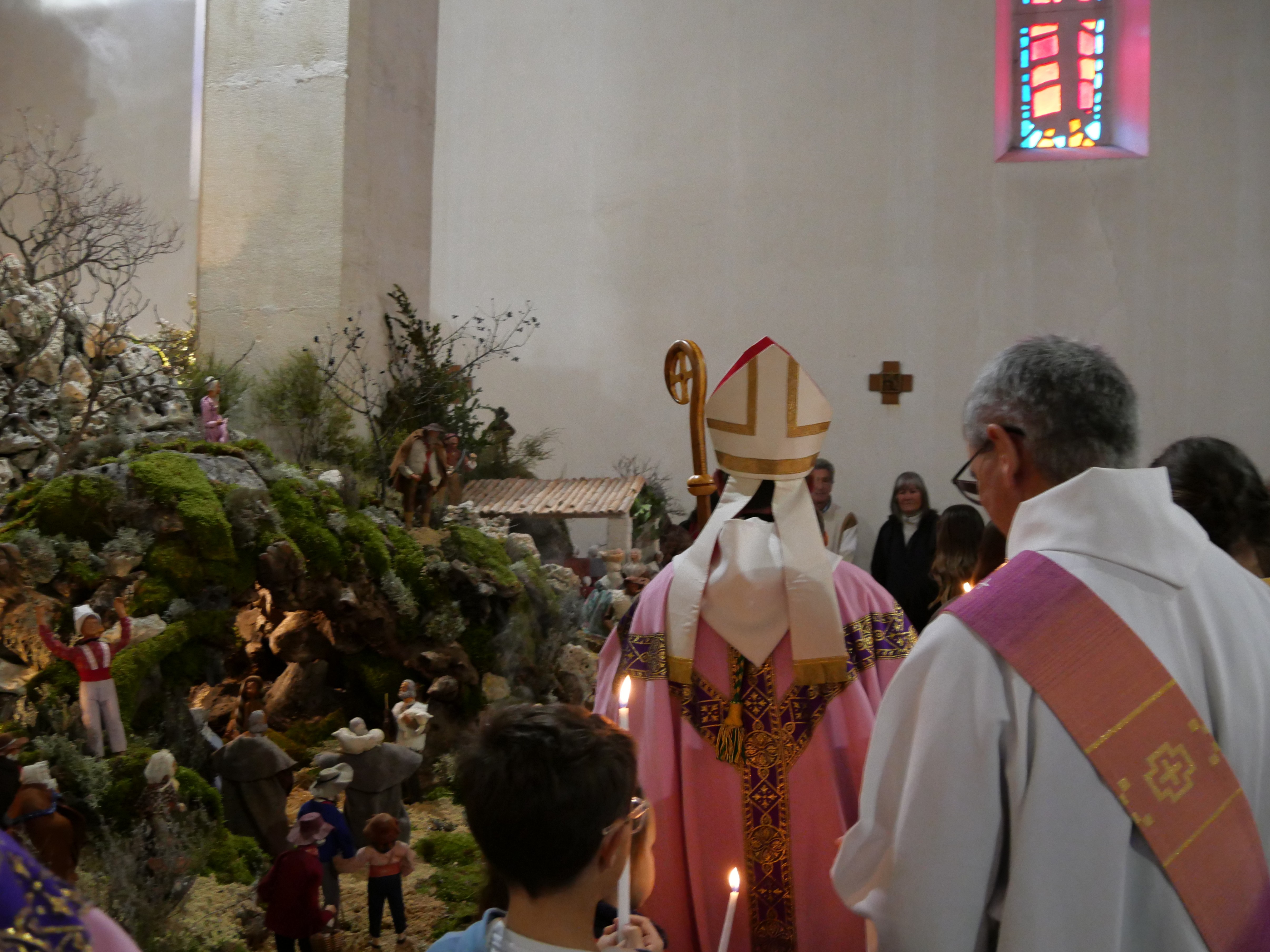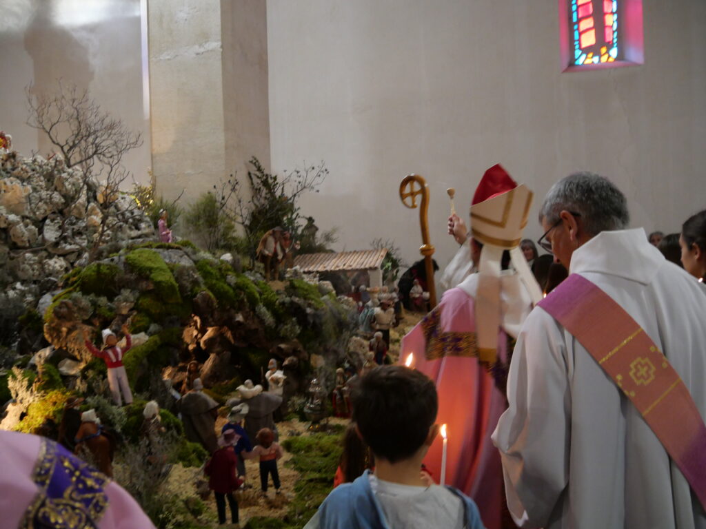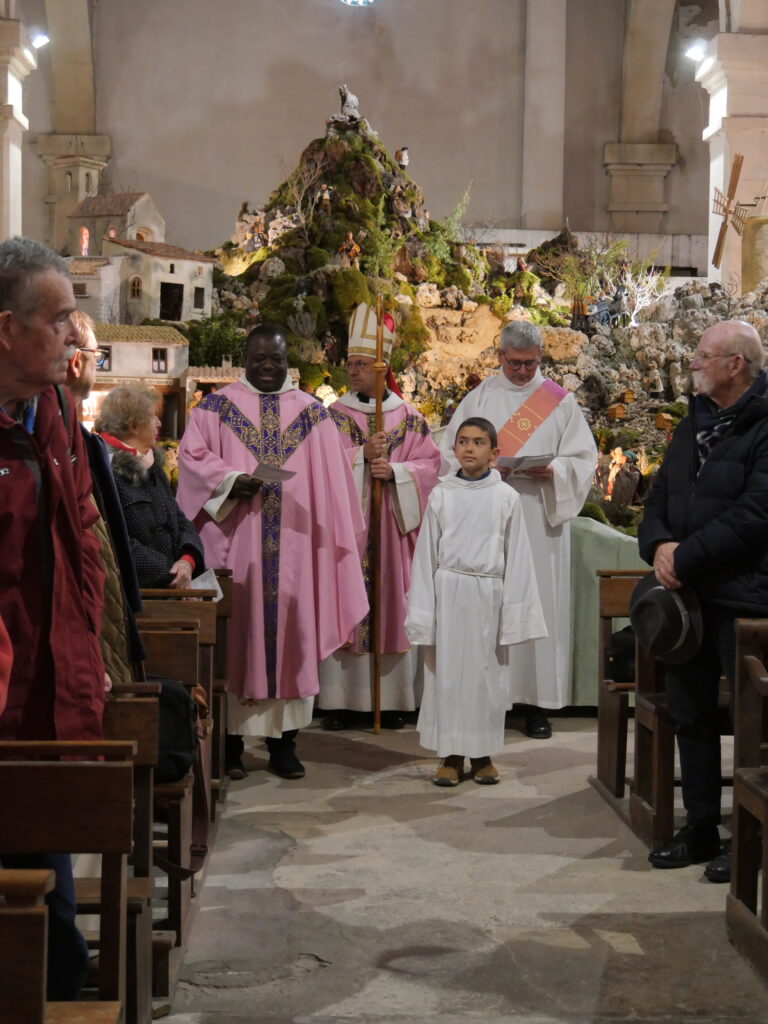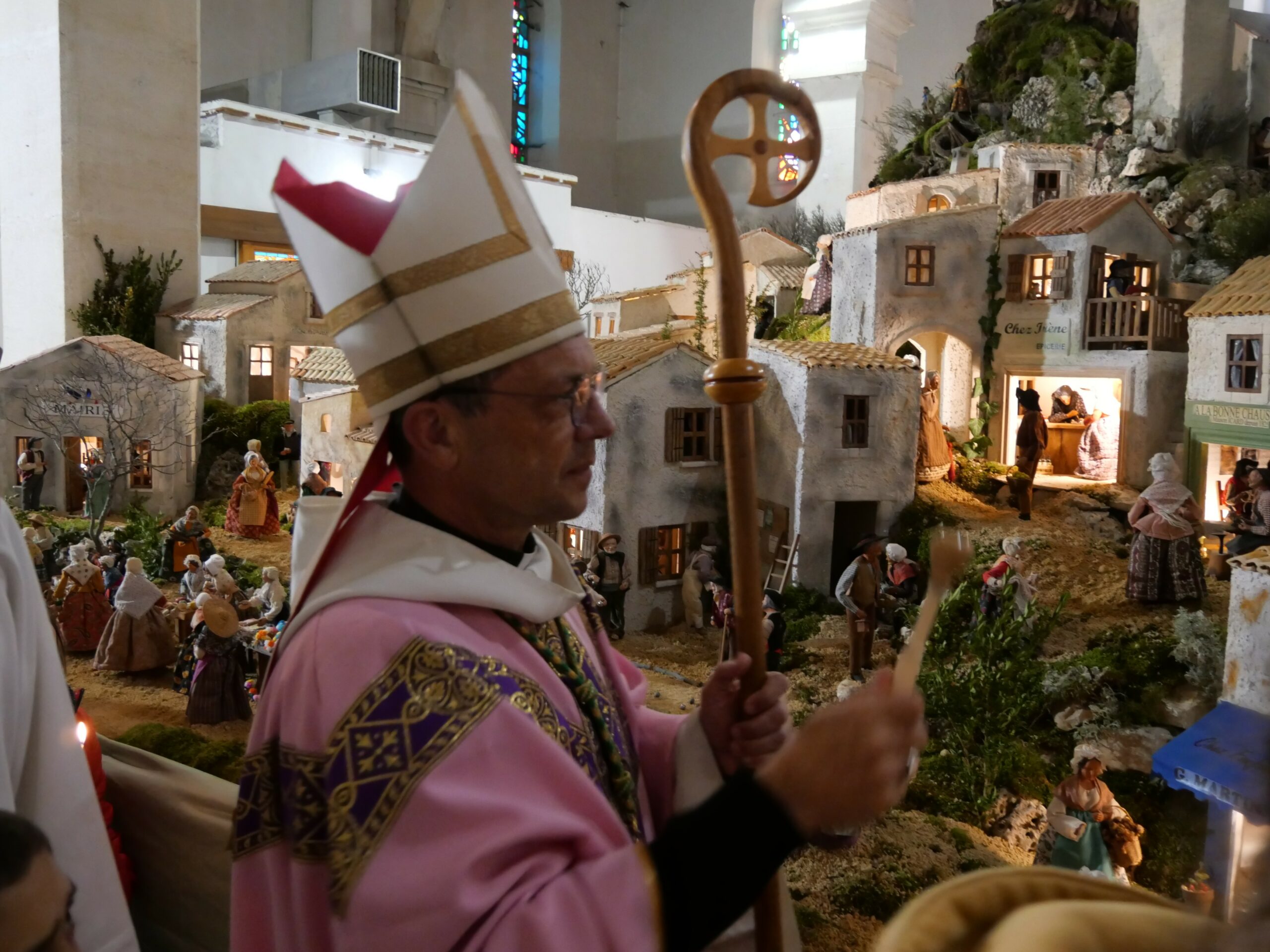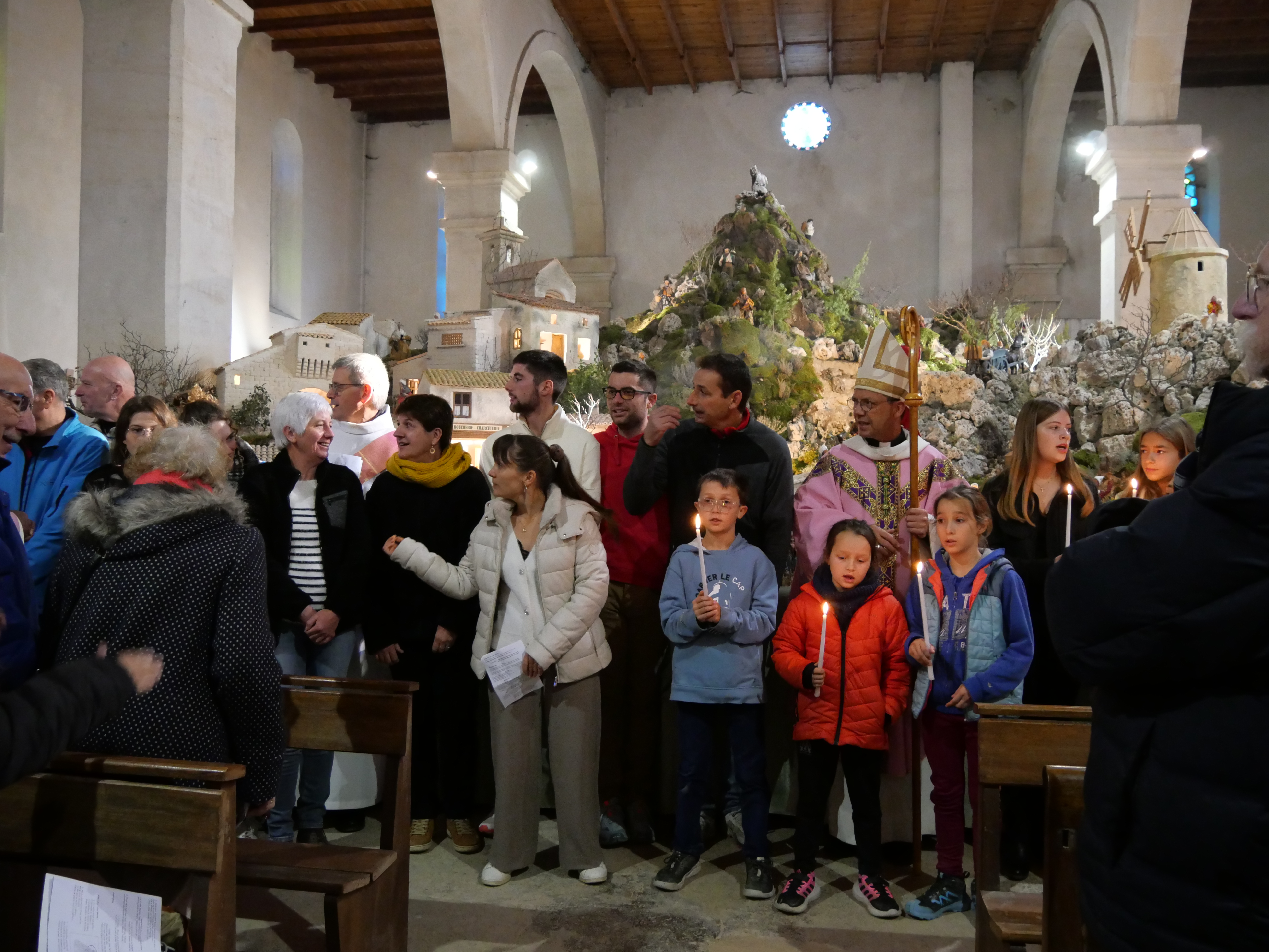 dimanche 14 décembre 2025, inauguration de la crèche de Banon, messe célébrée par Mgr Gobilliard Mgr rencontre Carlos, principal crèchiste.