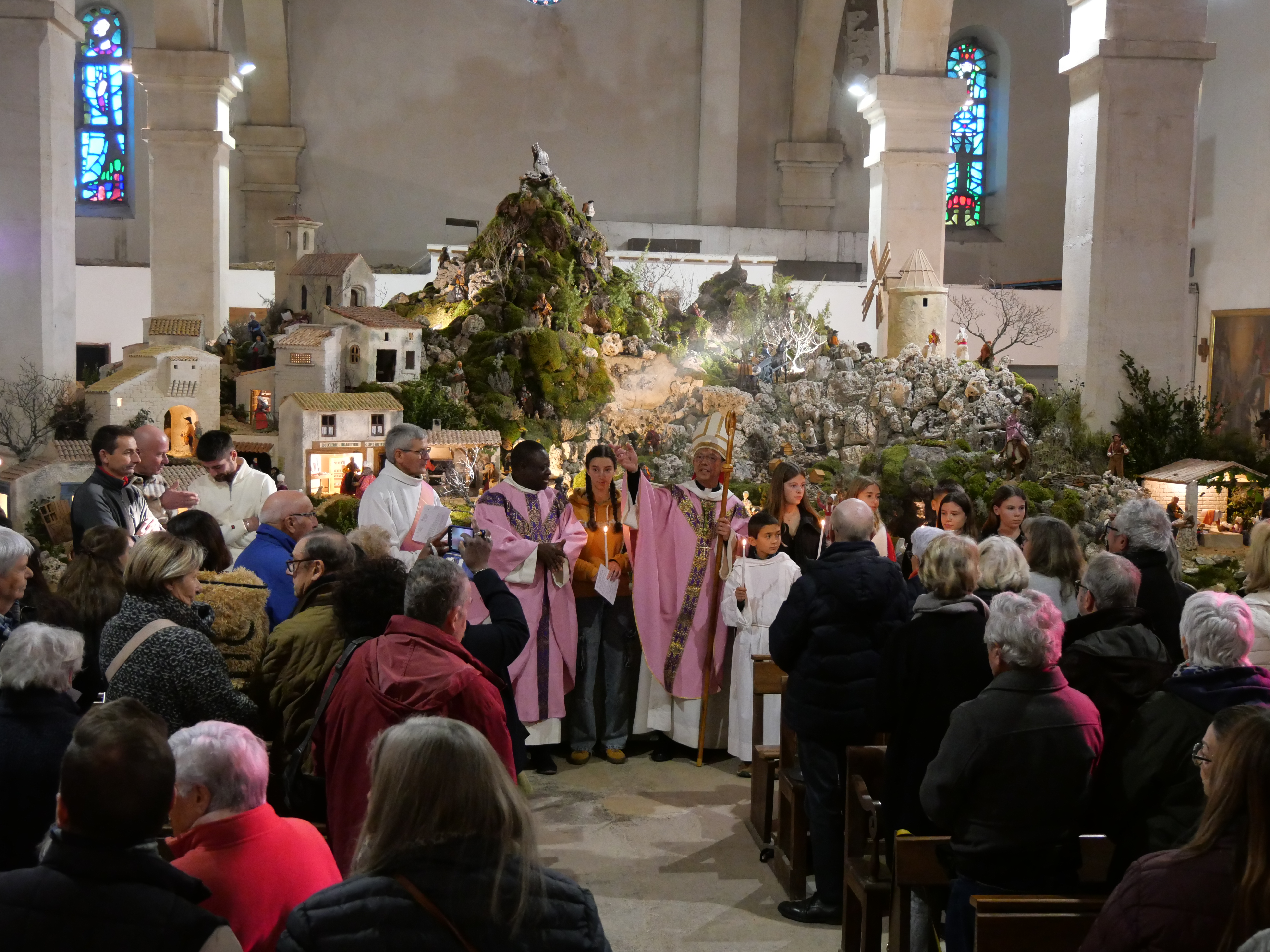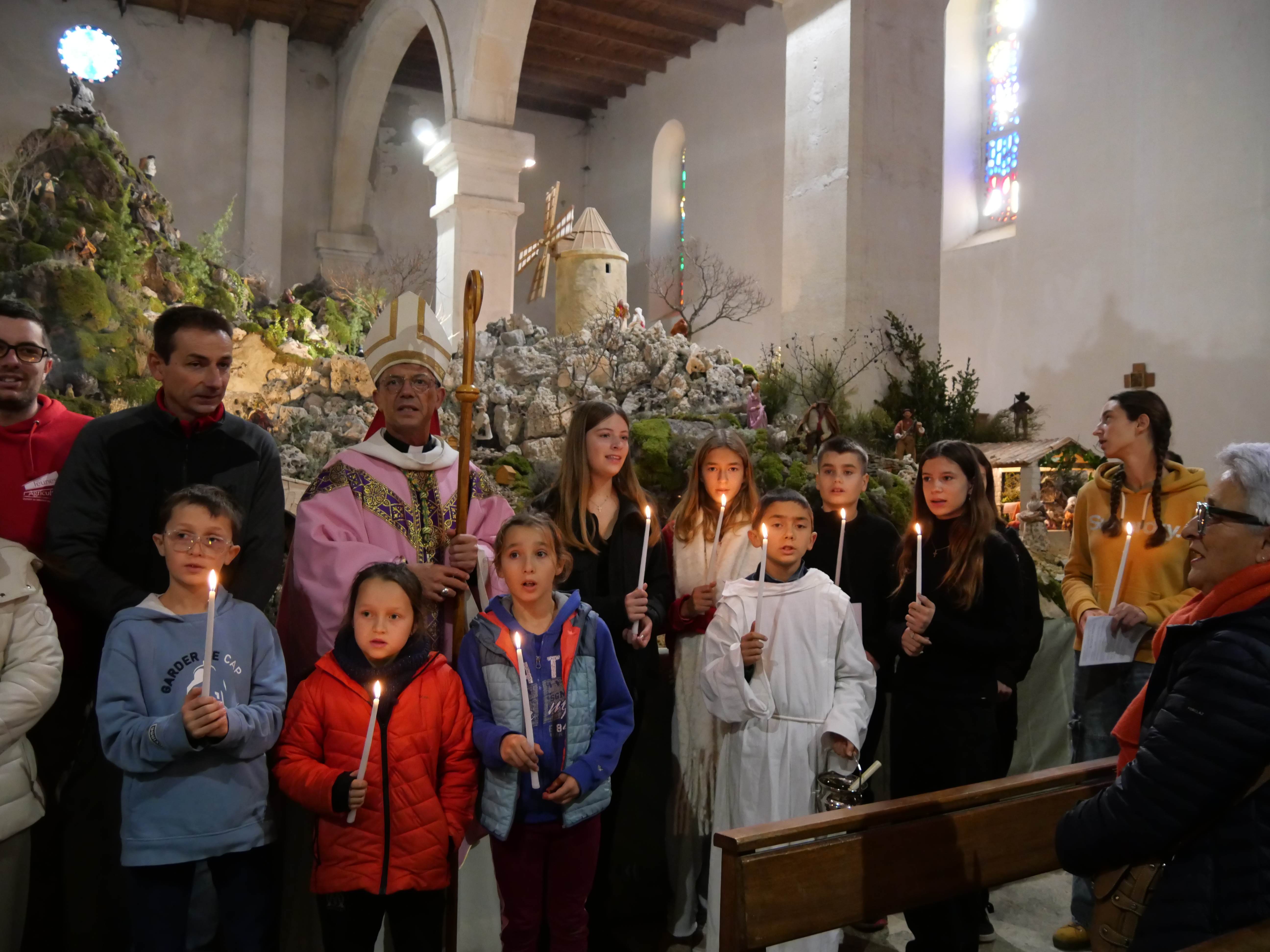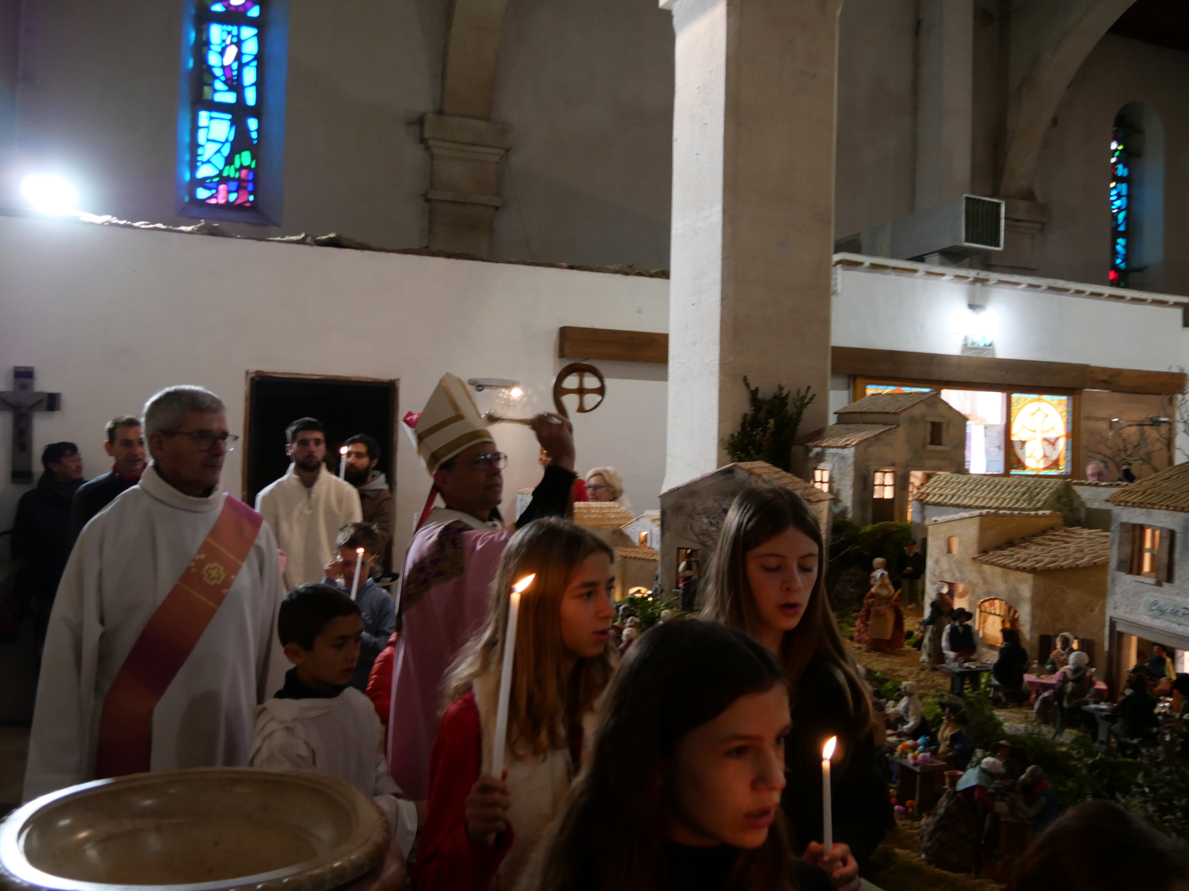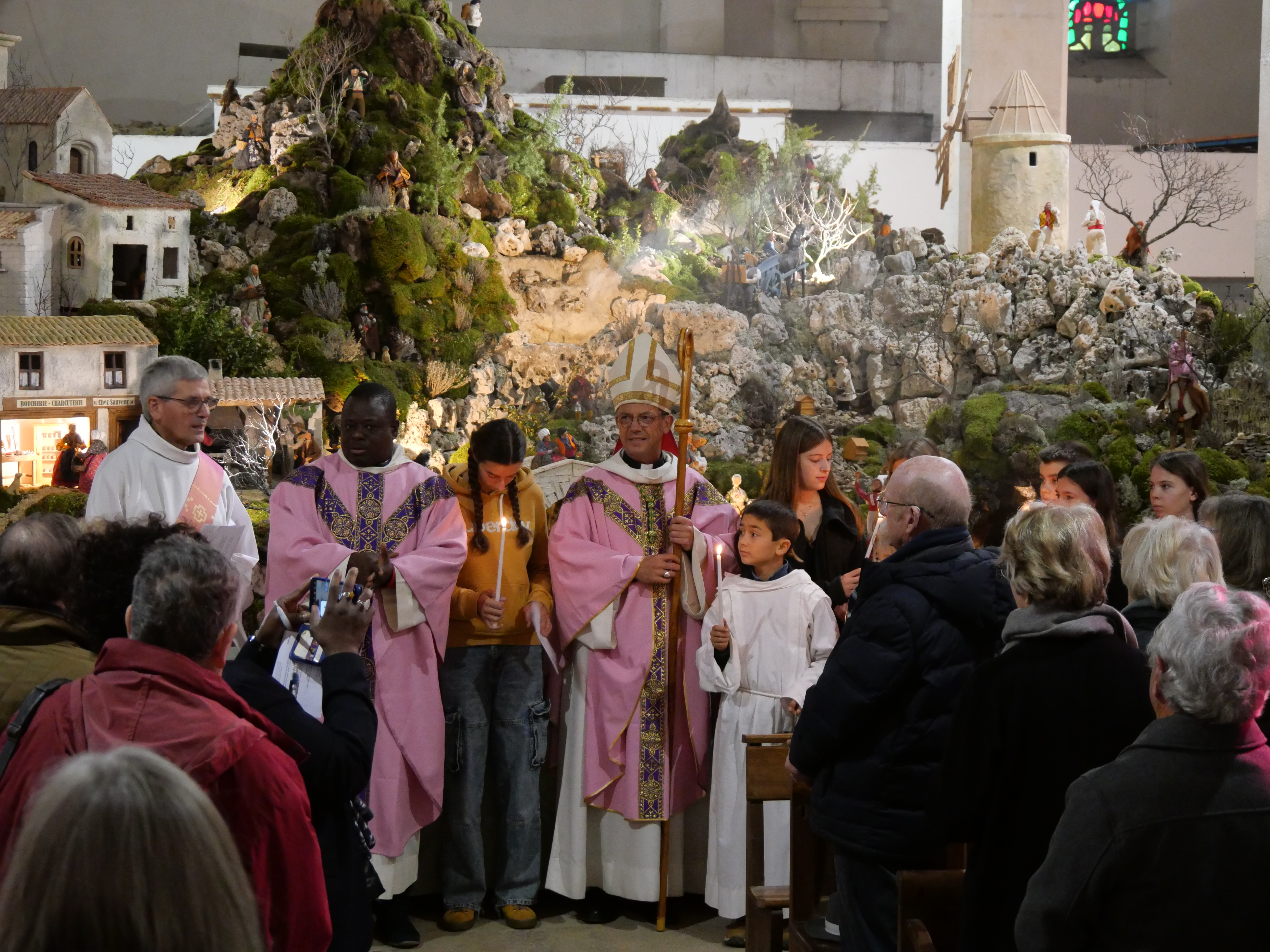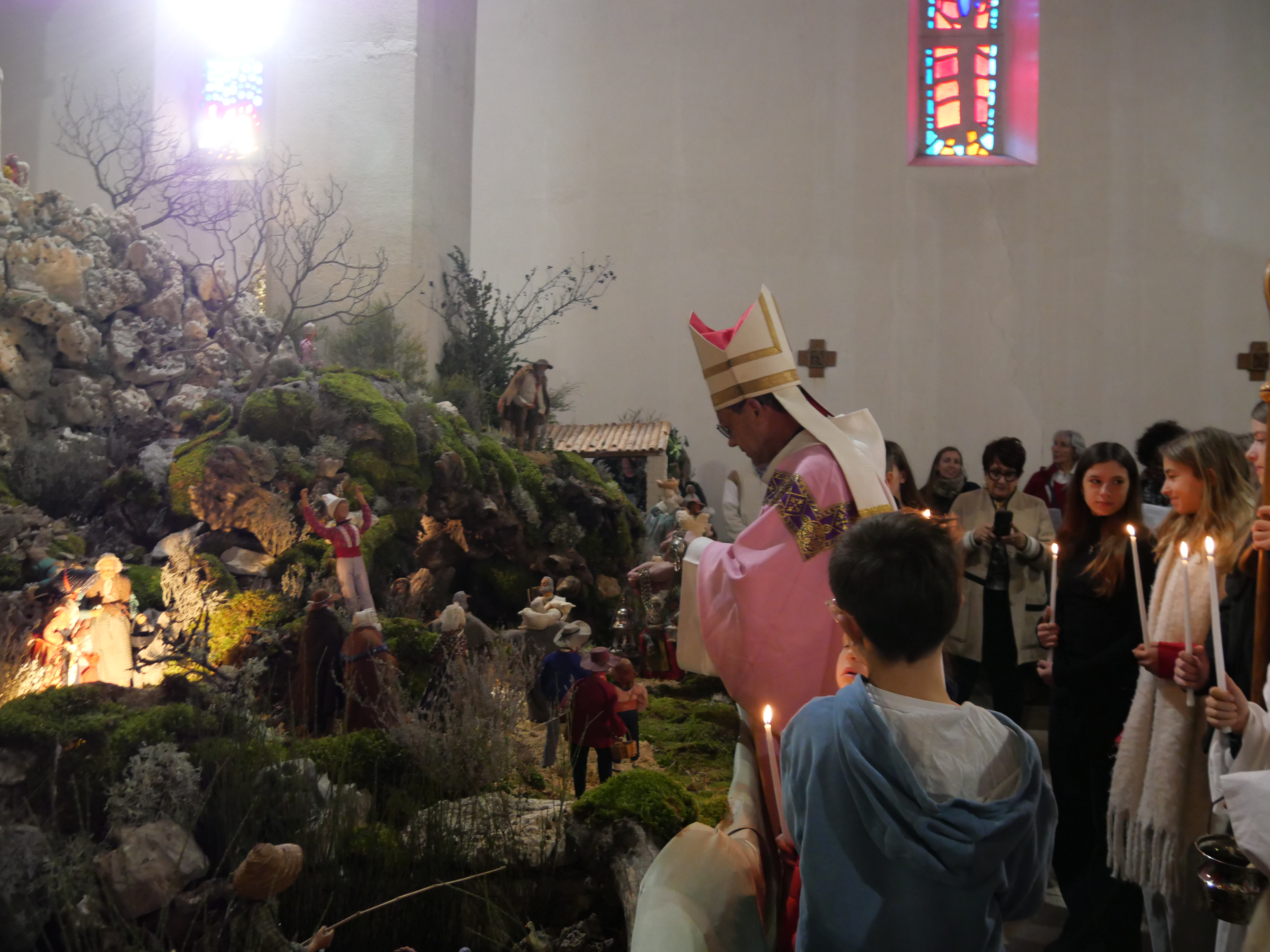 dimanche 14 décembre 2025, inauguration de la crèche de Banon, messe célébrée par Mgr Gobilliard Mgr rencontre Carlos, principal crèchiste.