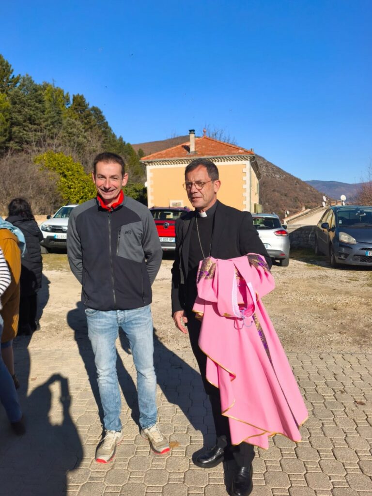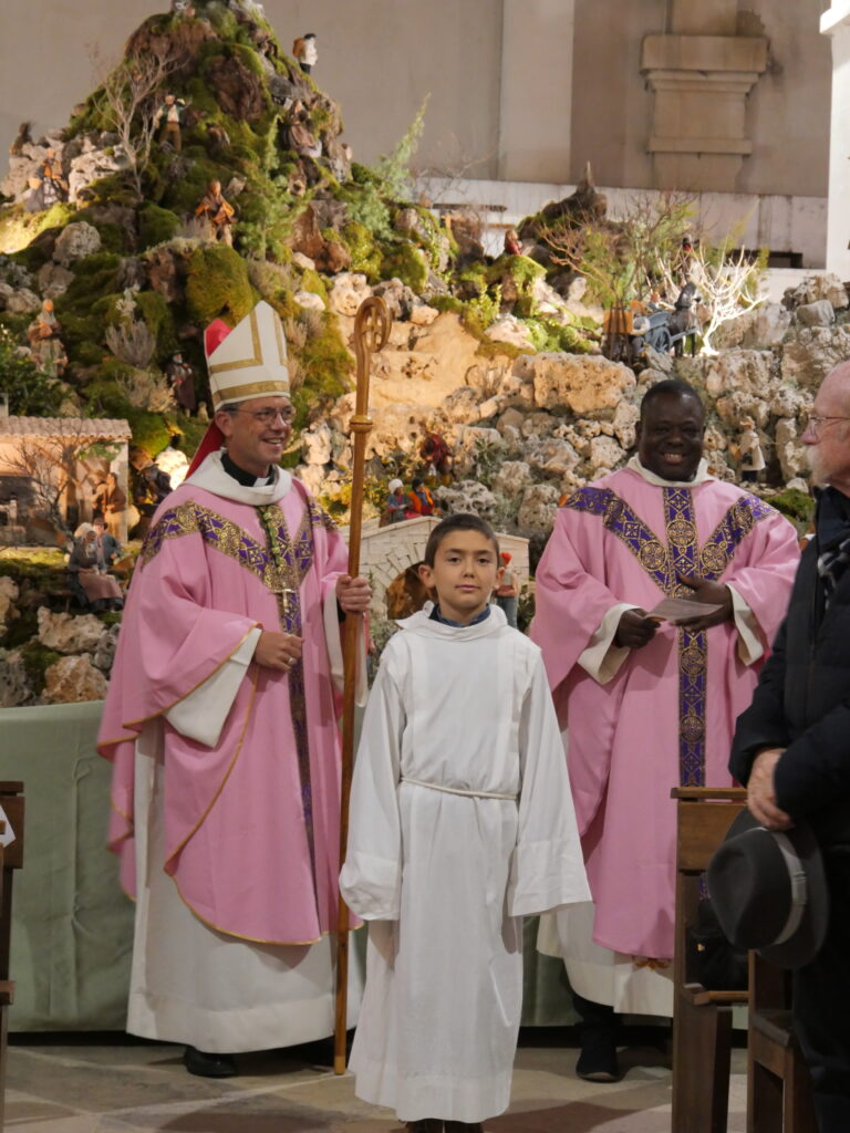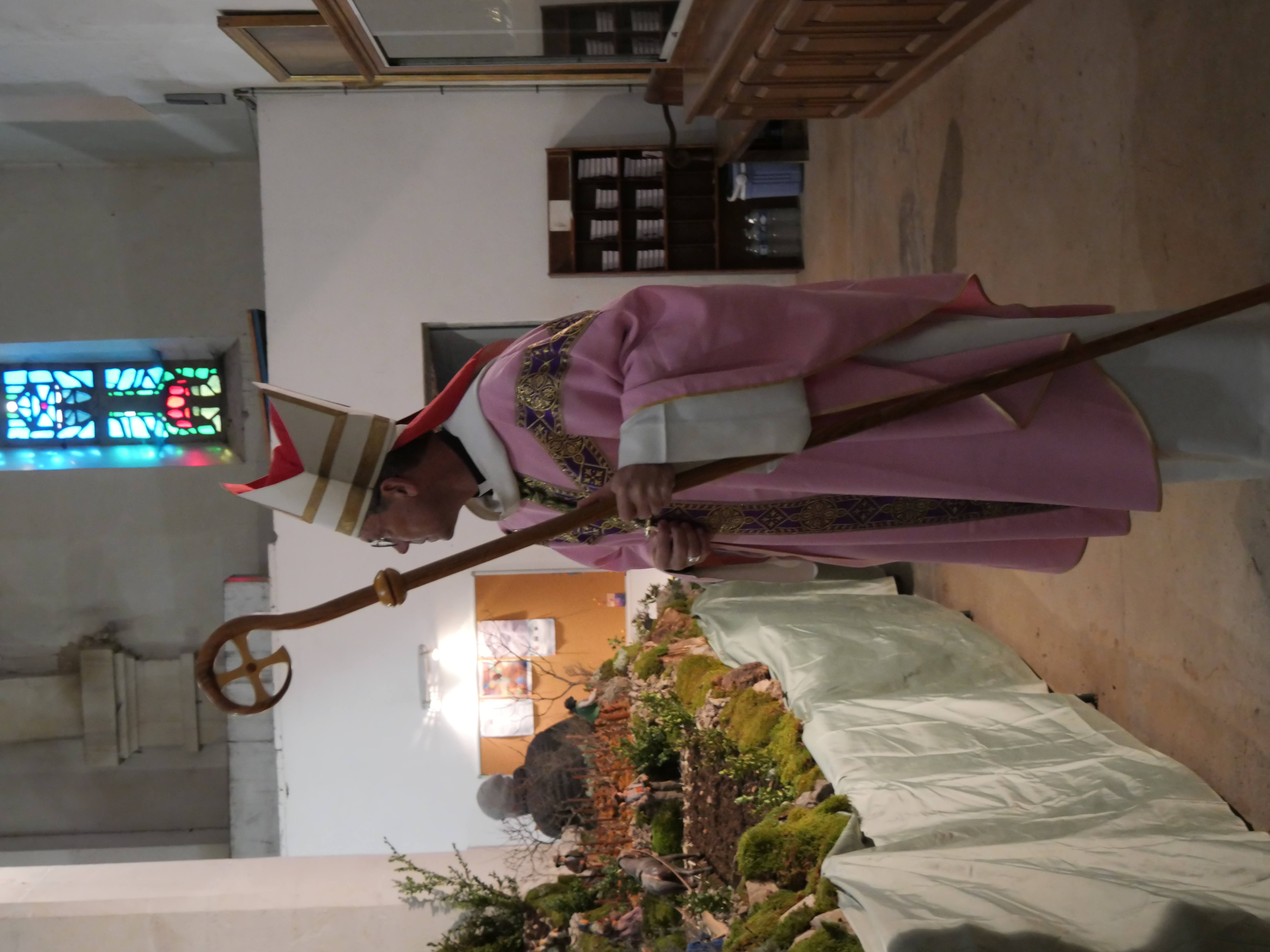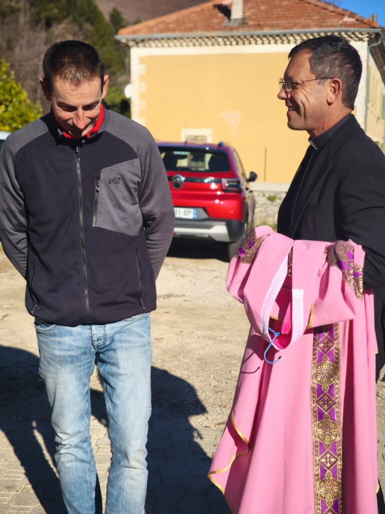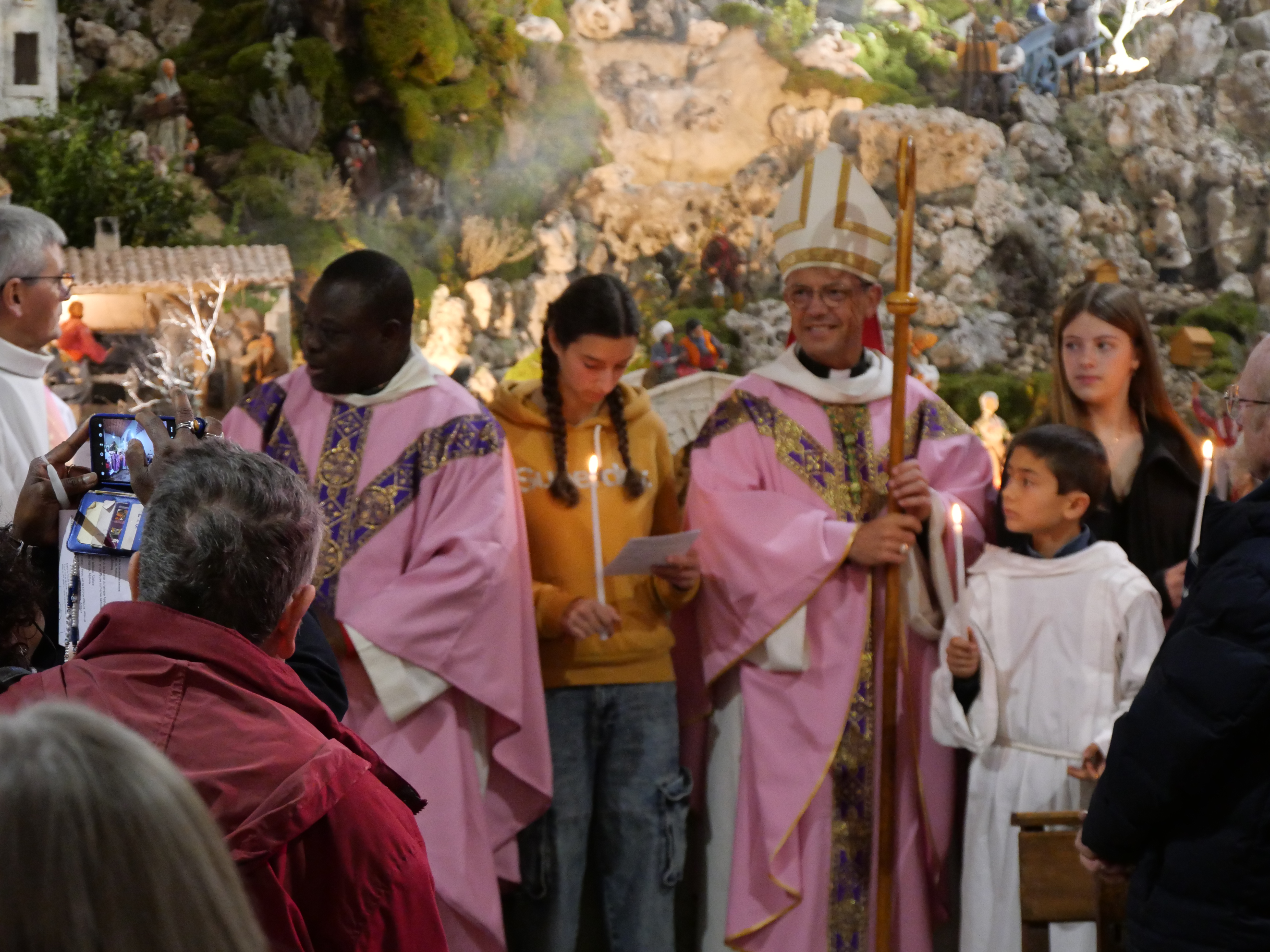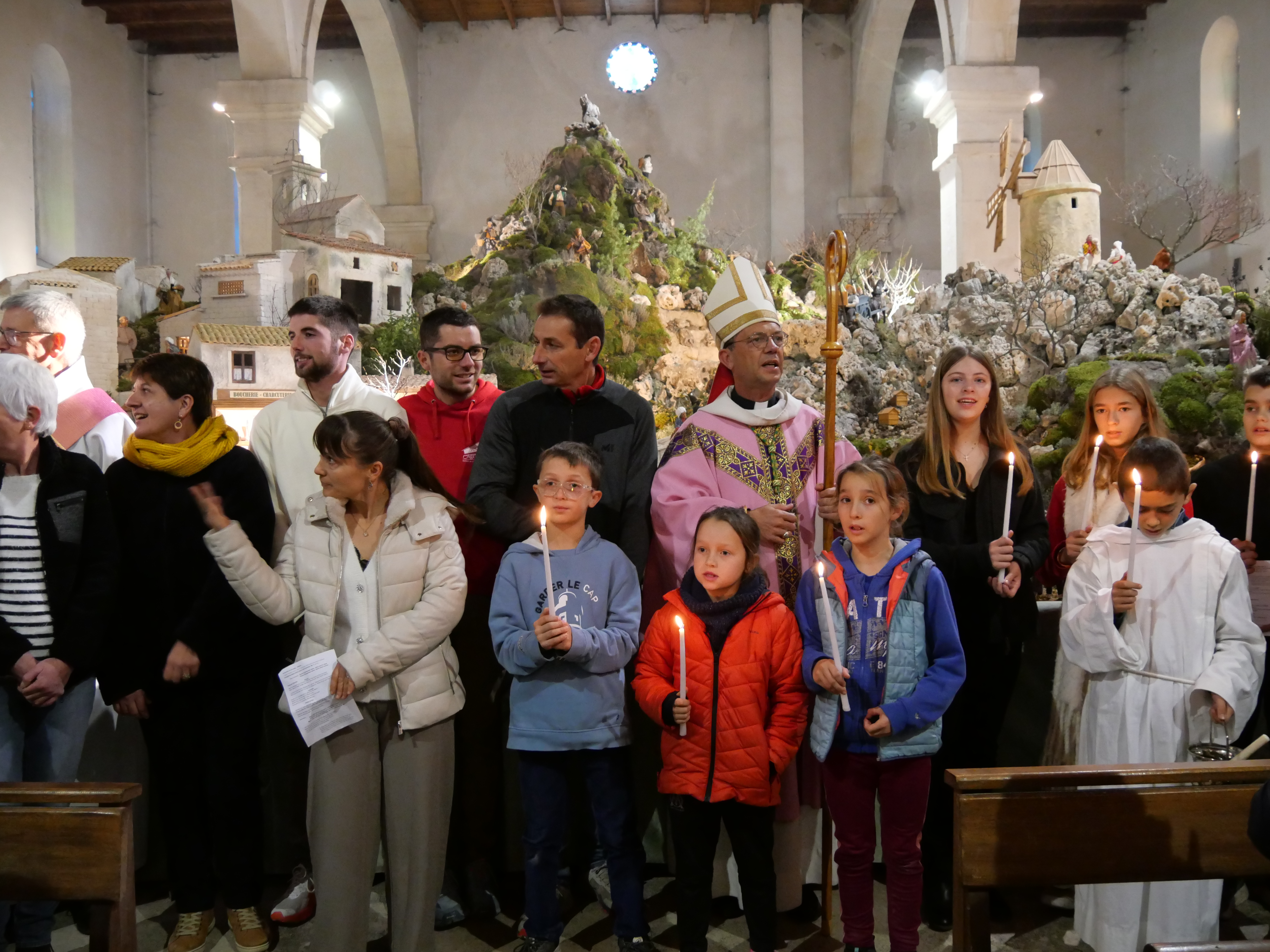 dimanche 14 décembre 2025, inauguration de la crèche de Banon, messe célébrée par Mgr Gobilliard Mgr rencontre Carlos, principal crèchiste.