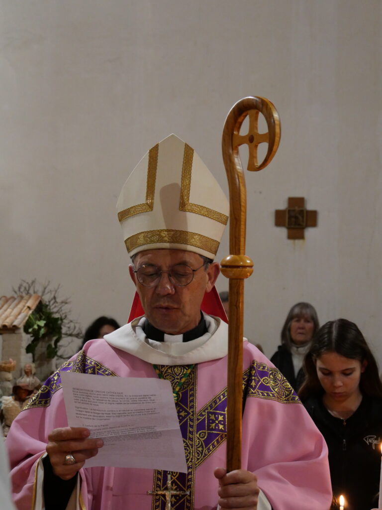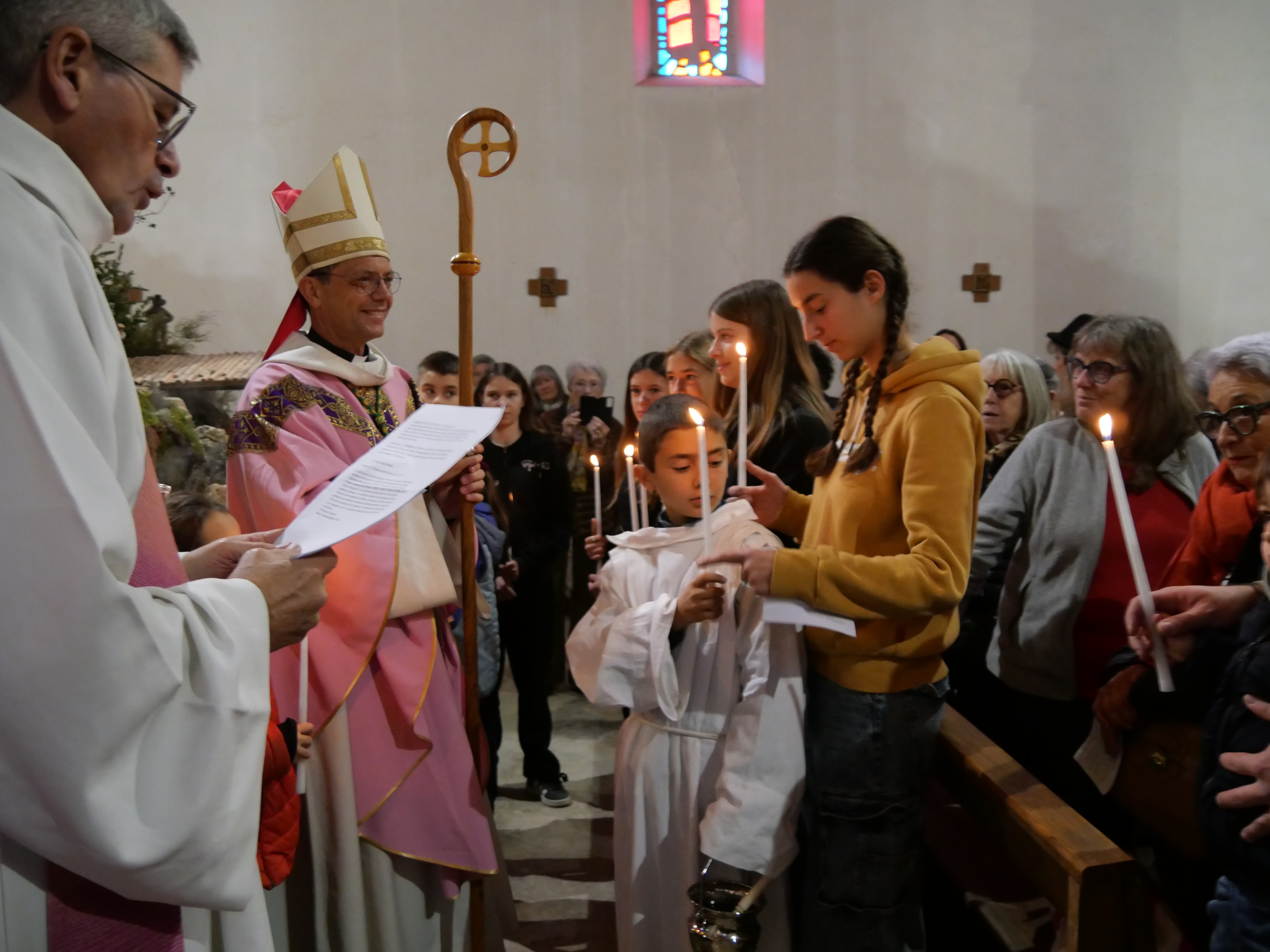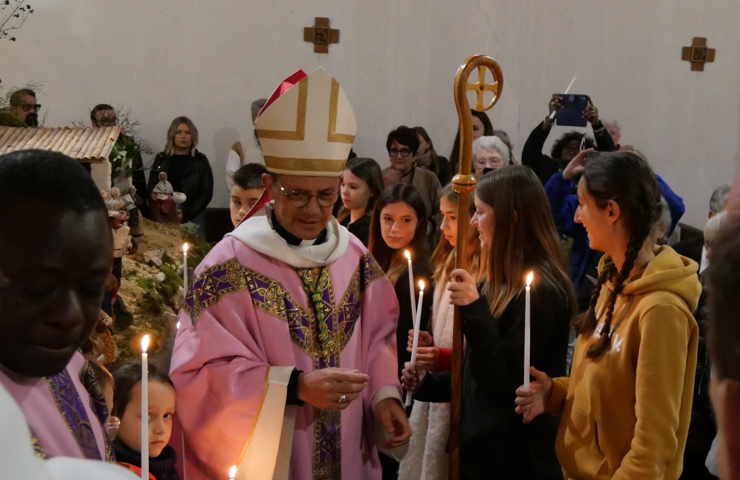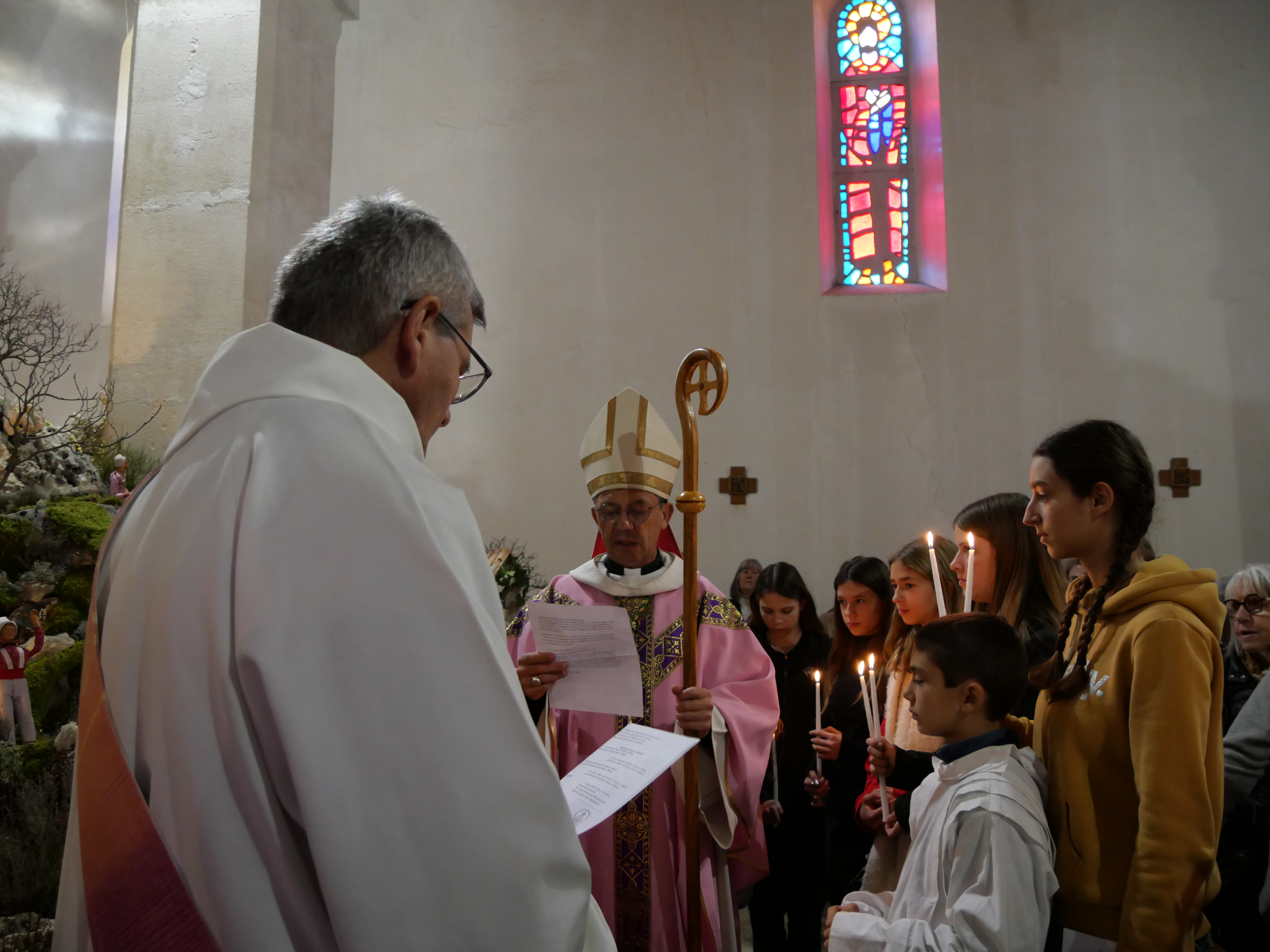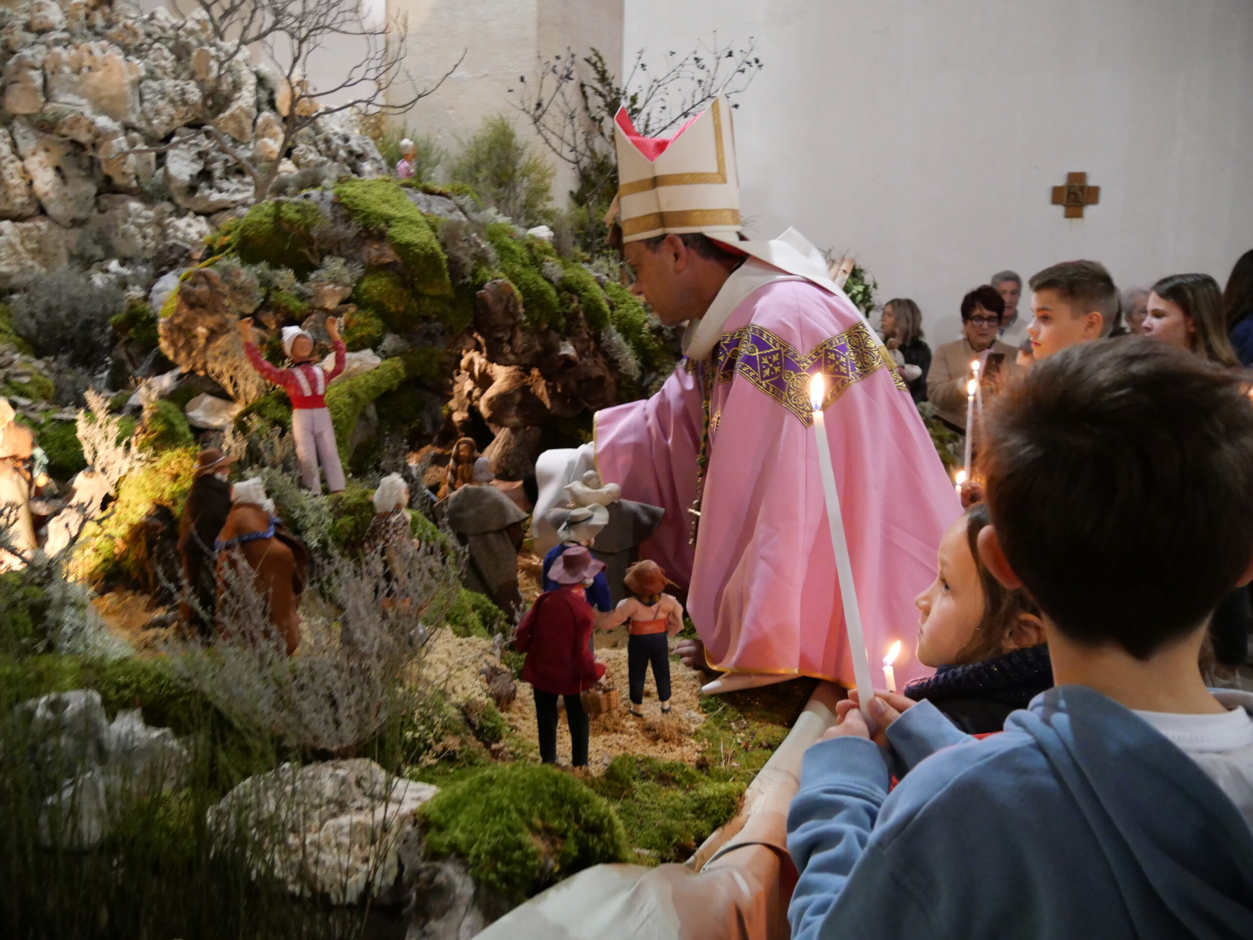 dimanche 14 décembre 2025, inauguration de la crèche de Banon, messe célébrée par Mgr Gobilliard Mgr rencontre Carlos, principal crèchiste.