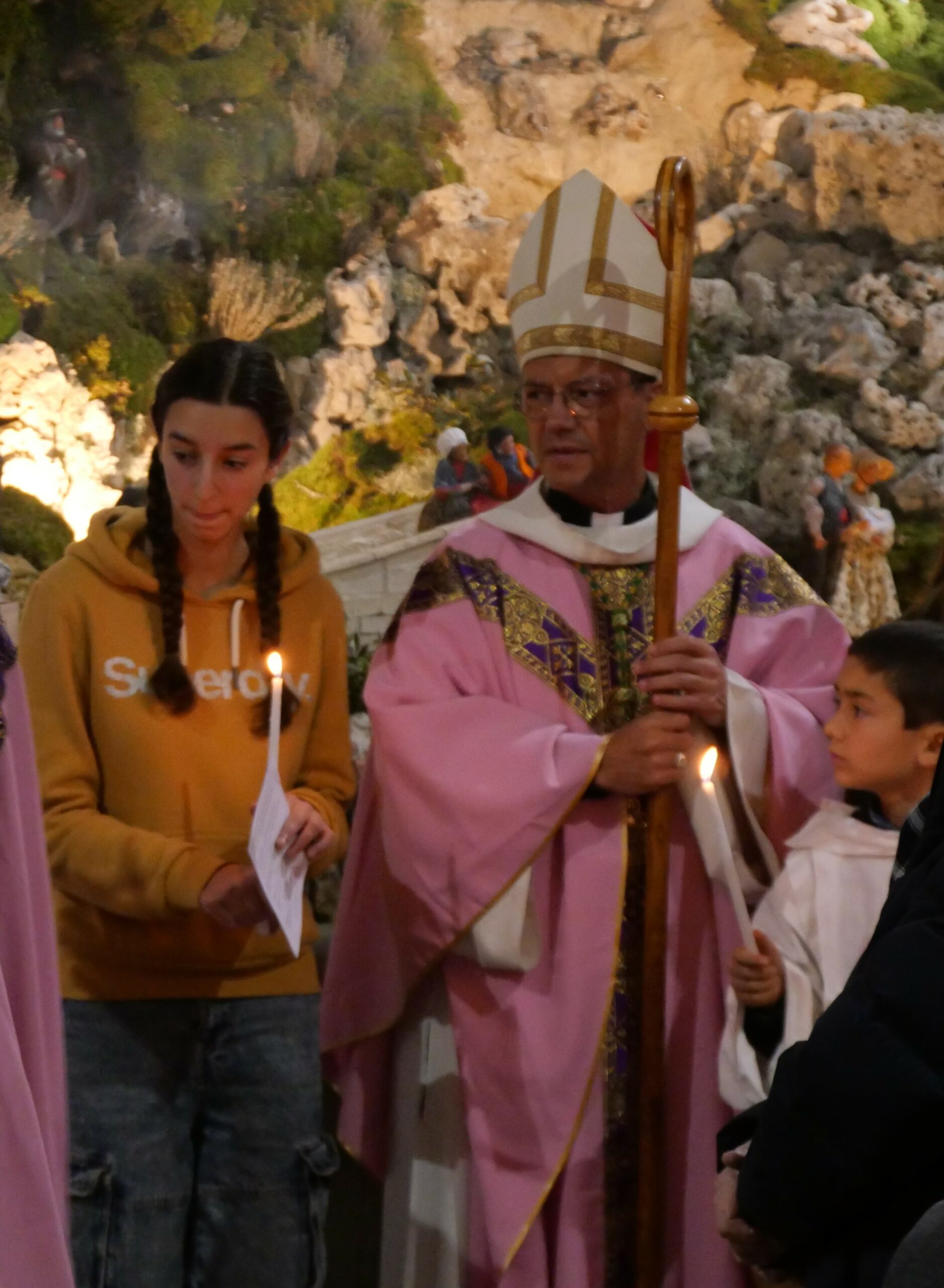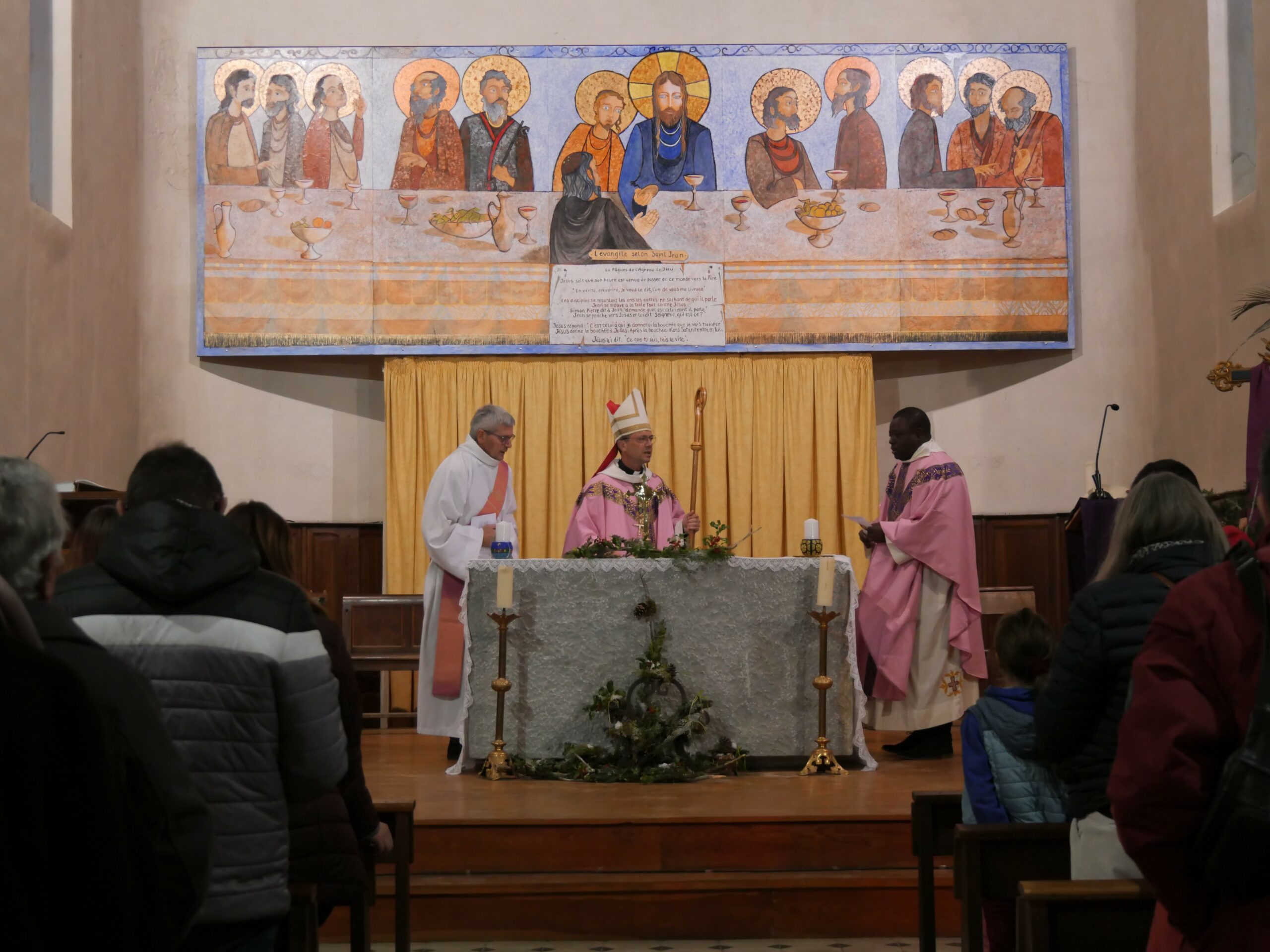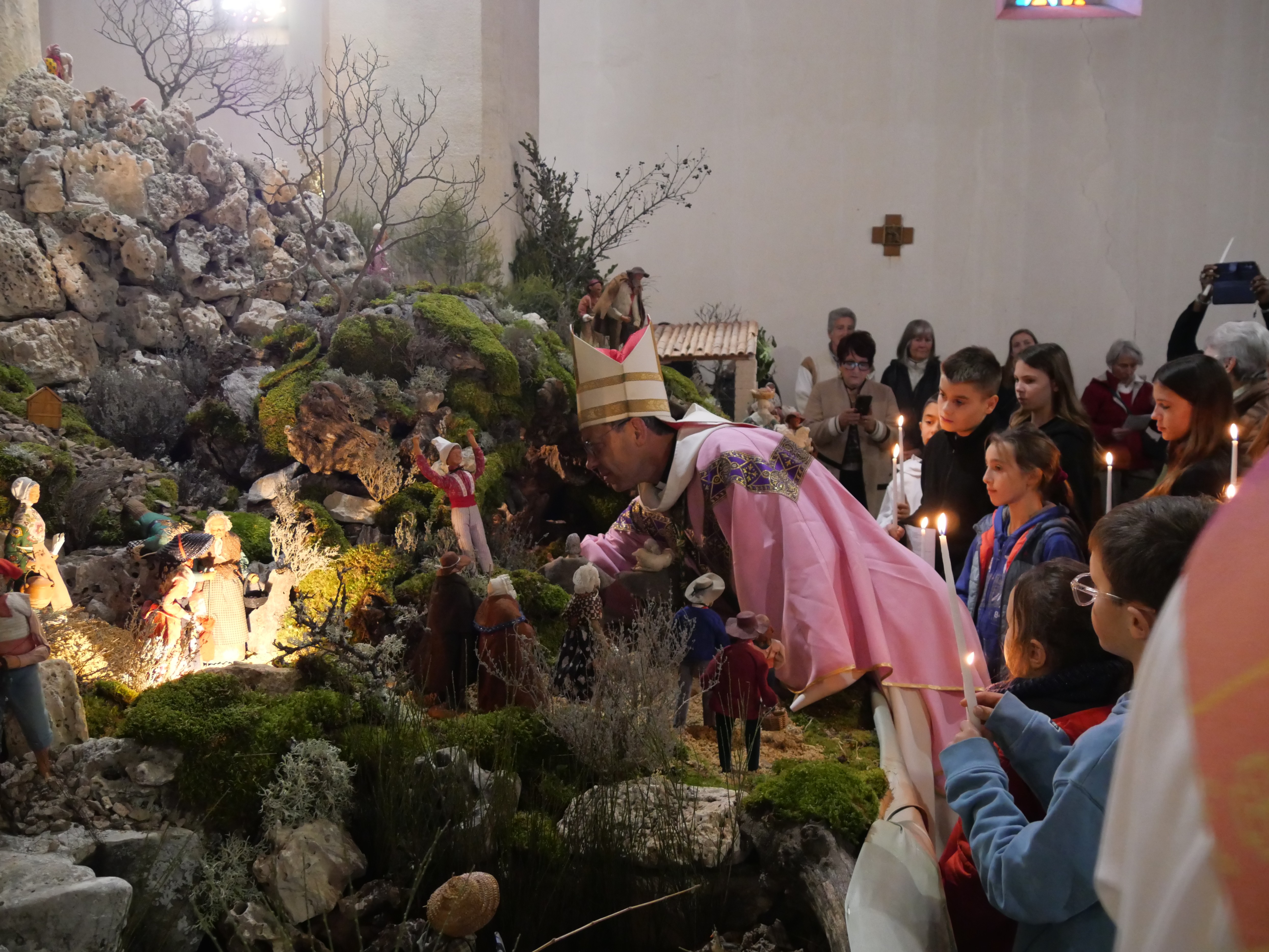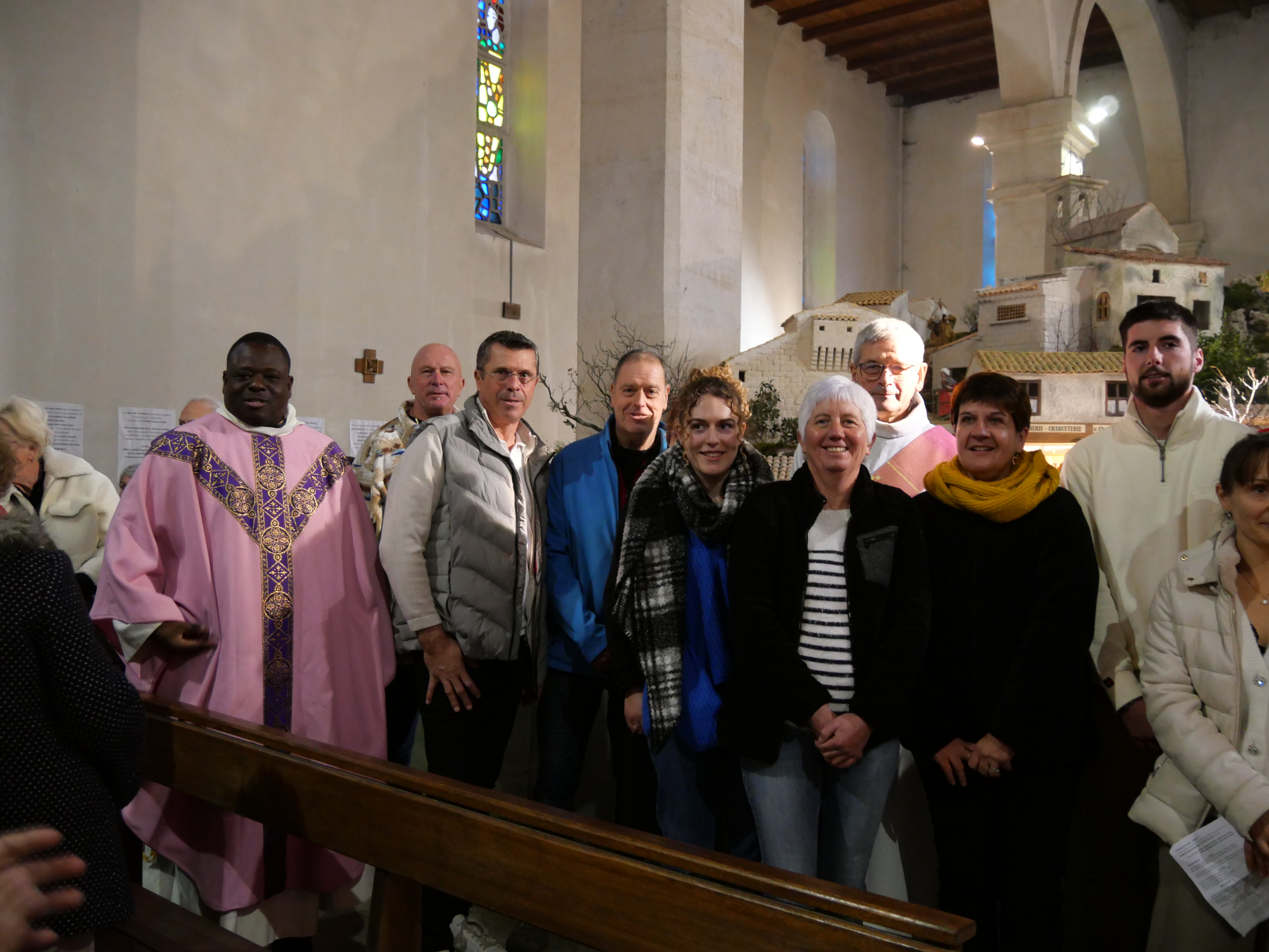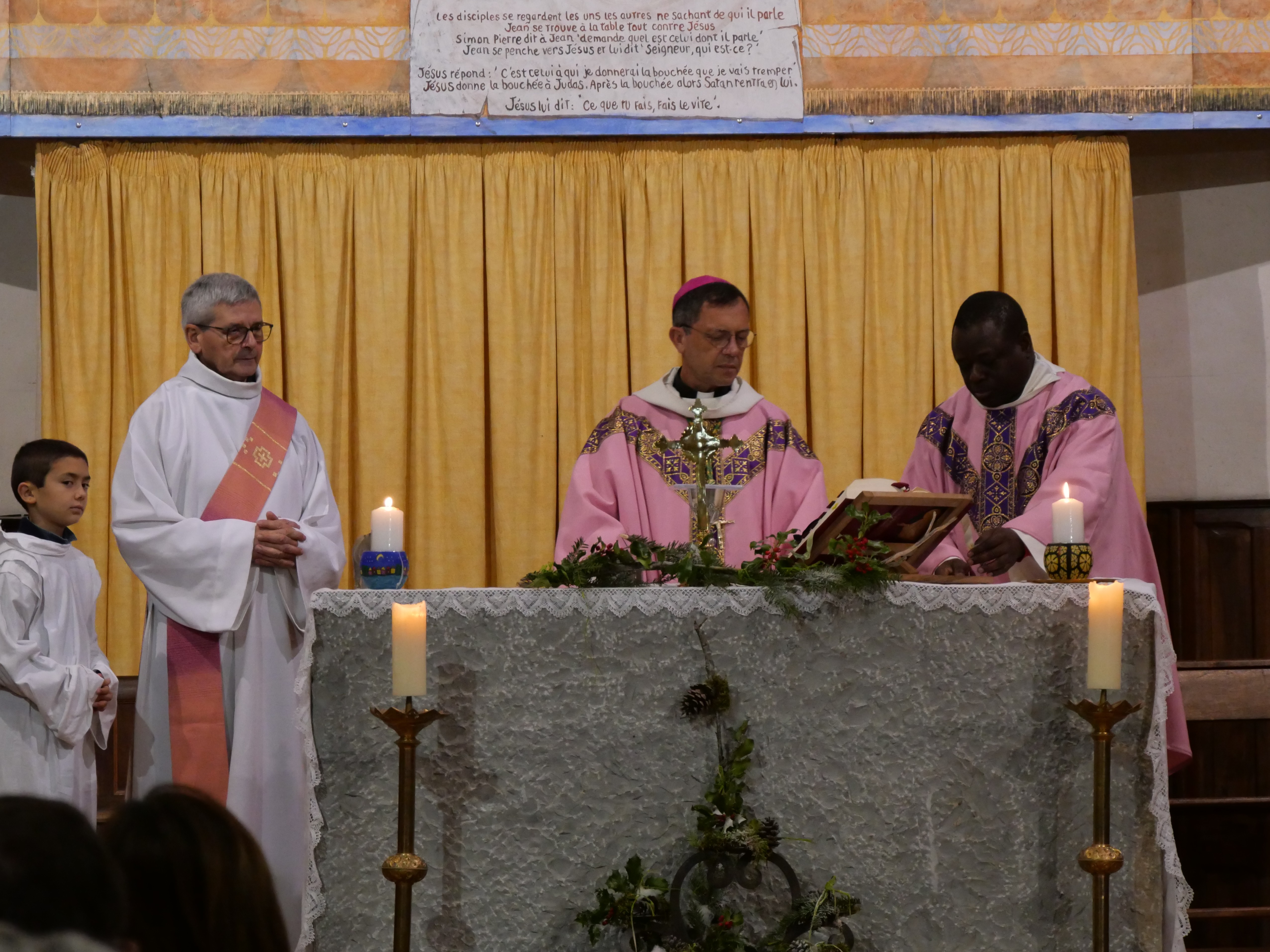 dimanche 14 décembre 2025, inauguration de la crèche de Banon, messe célébrée par Mgr Gobilliard Mgr rencontre Carlos, principal crèchiste.