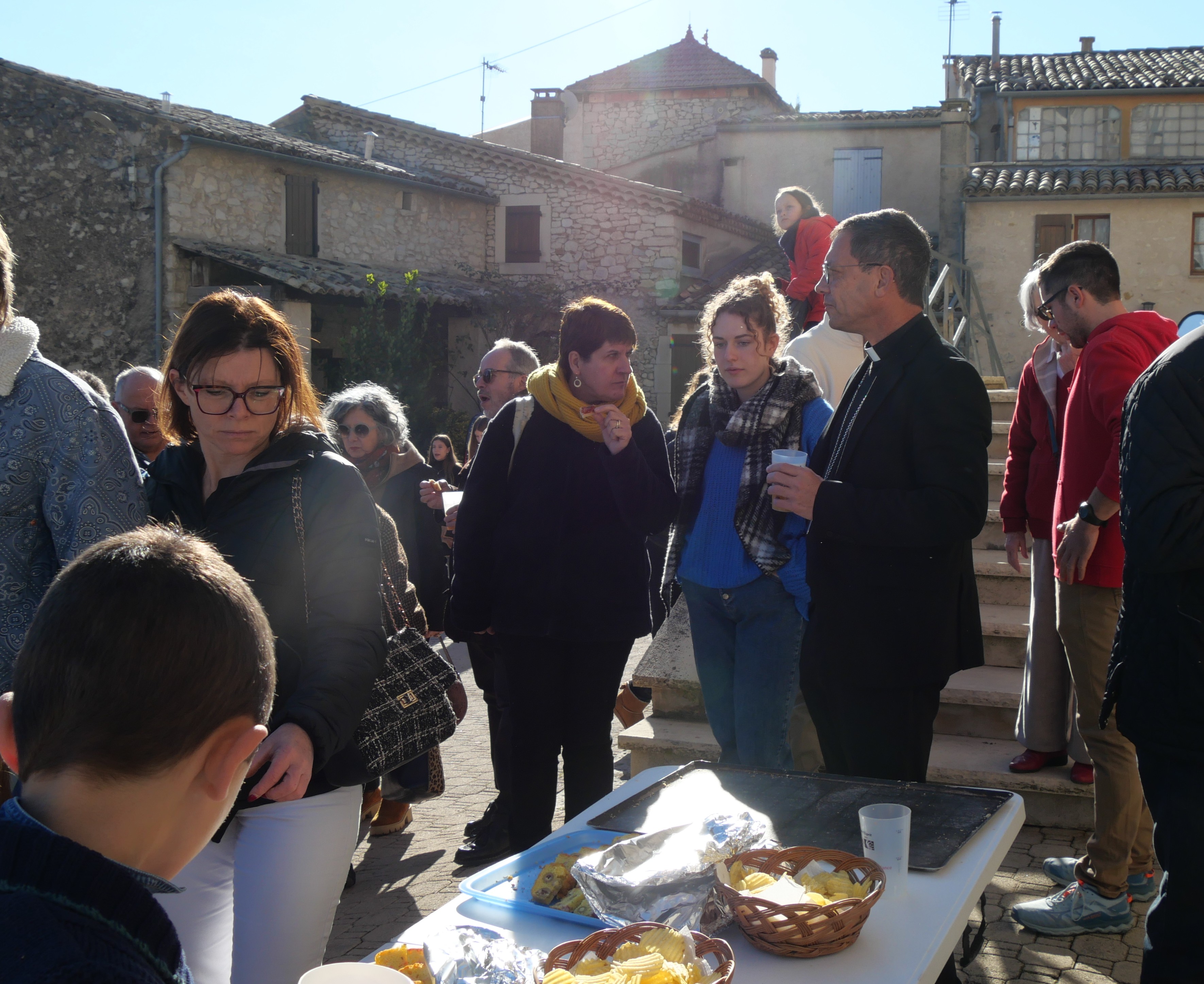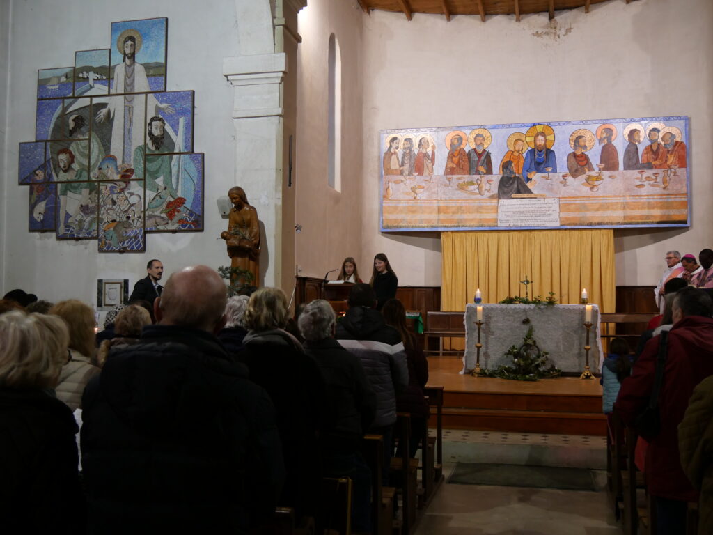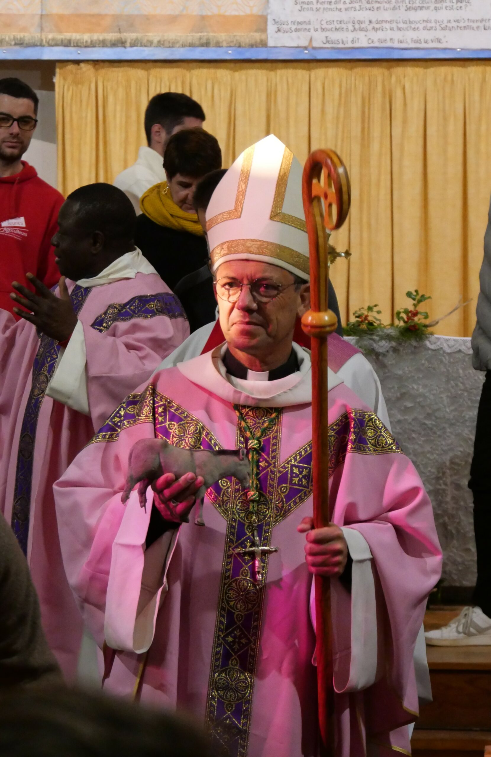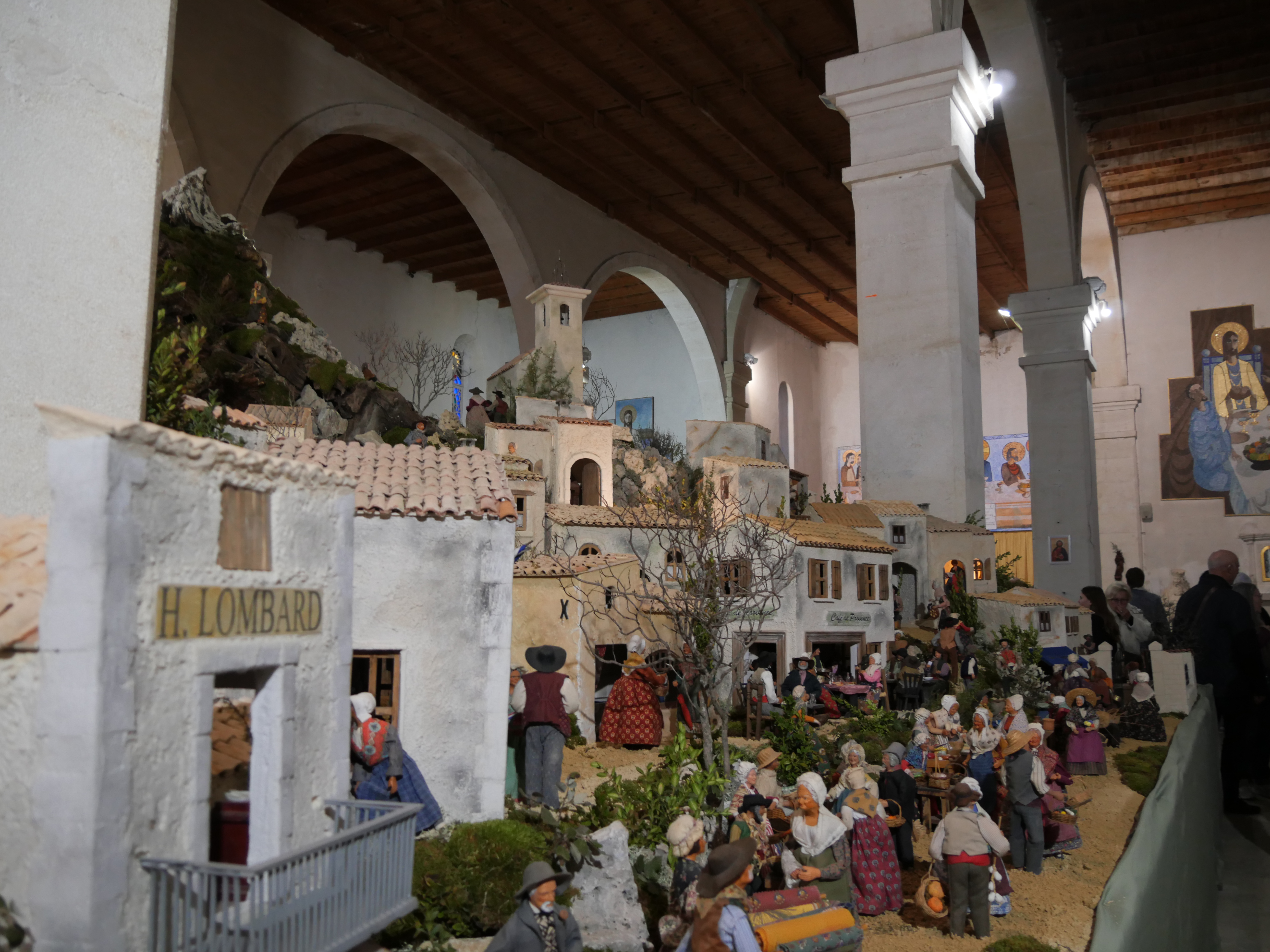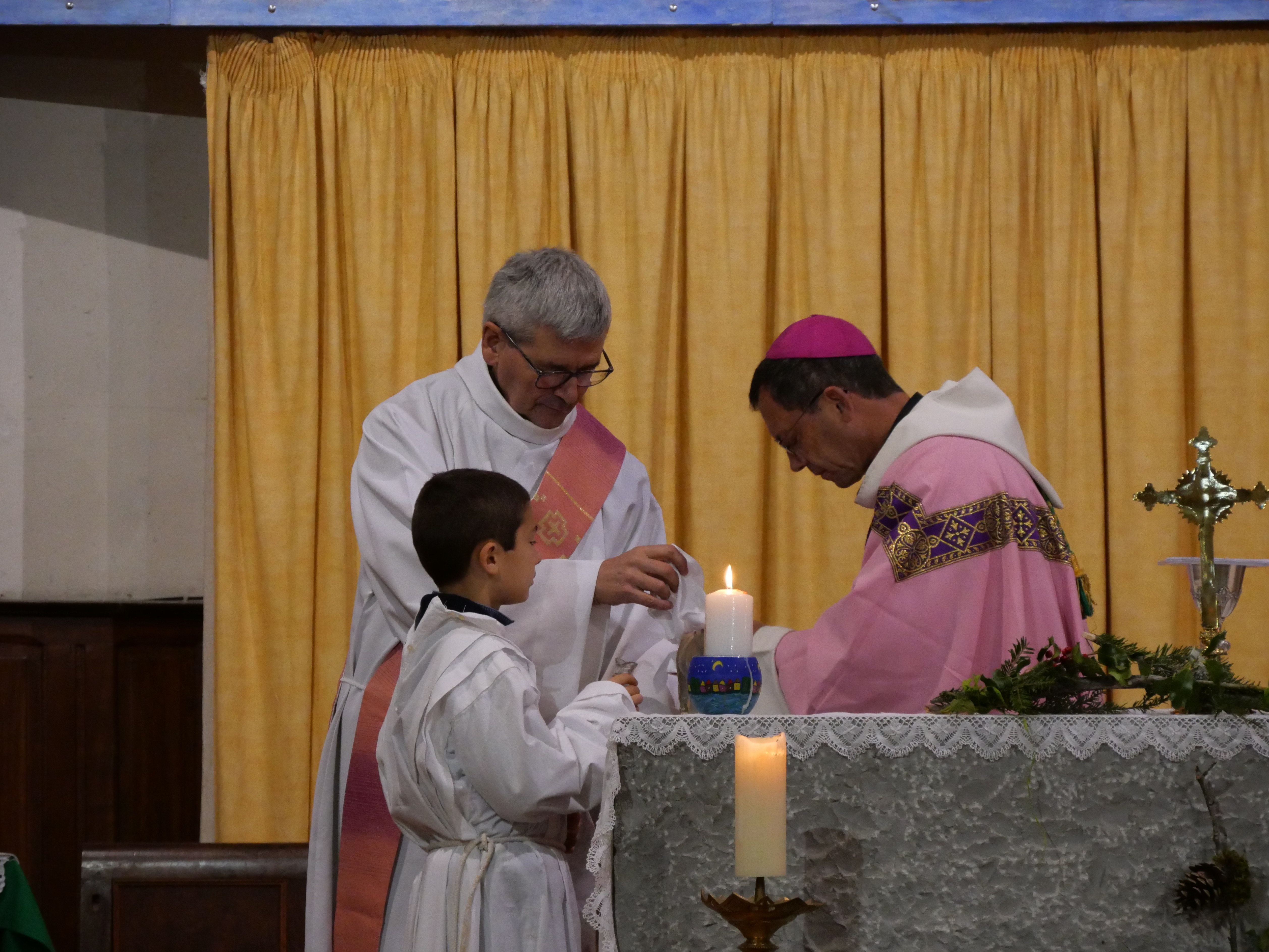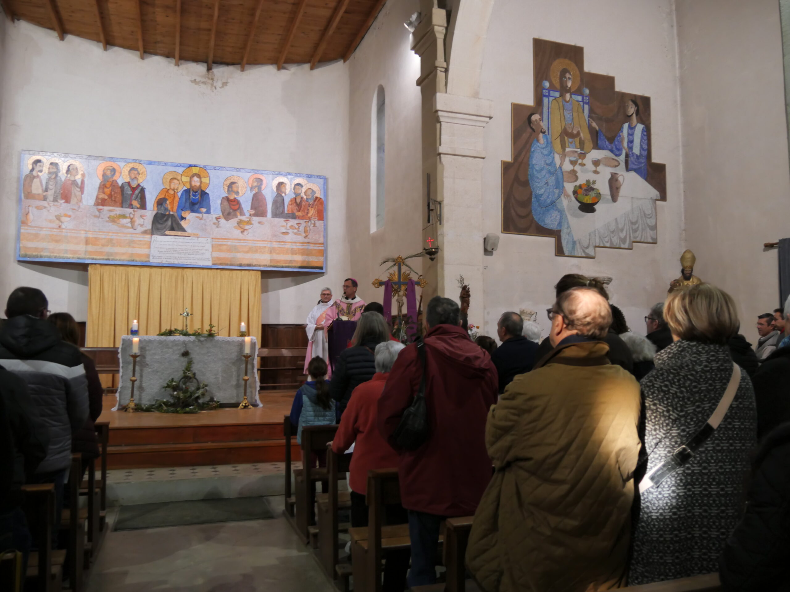 dimanche 14 décembre 2025, inauguration de la crèche de Banon, messe célébrée par Mgr Gobilliard Mgr rencontre Carlos, principal crèchiste.