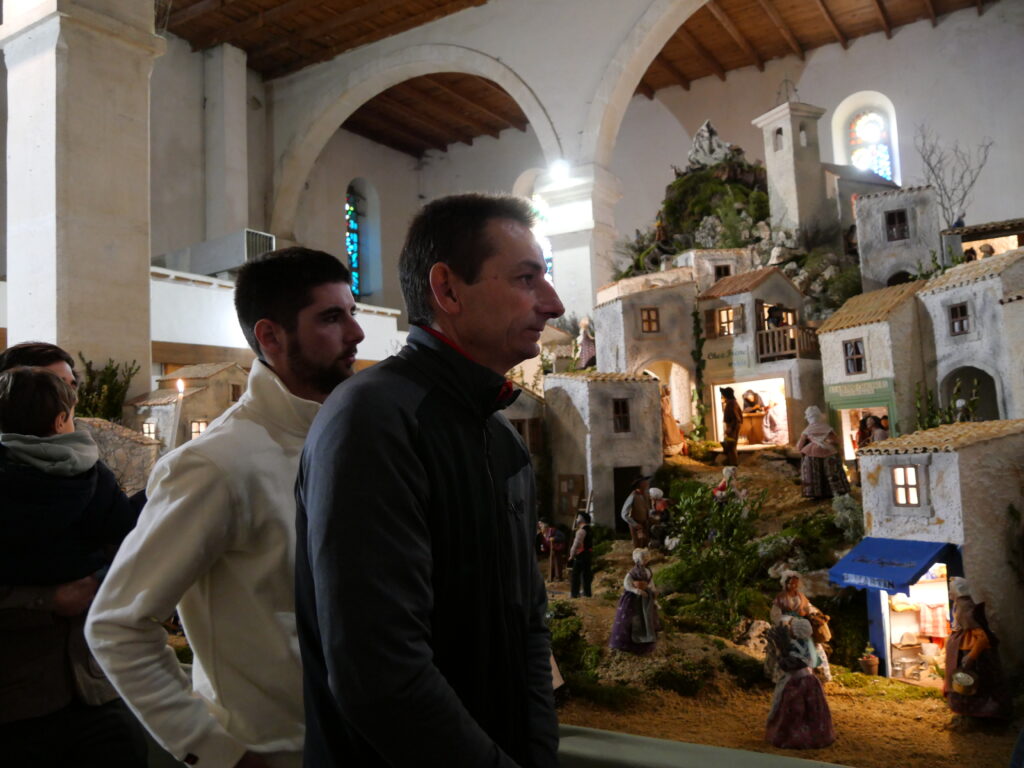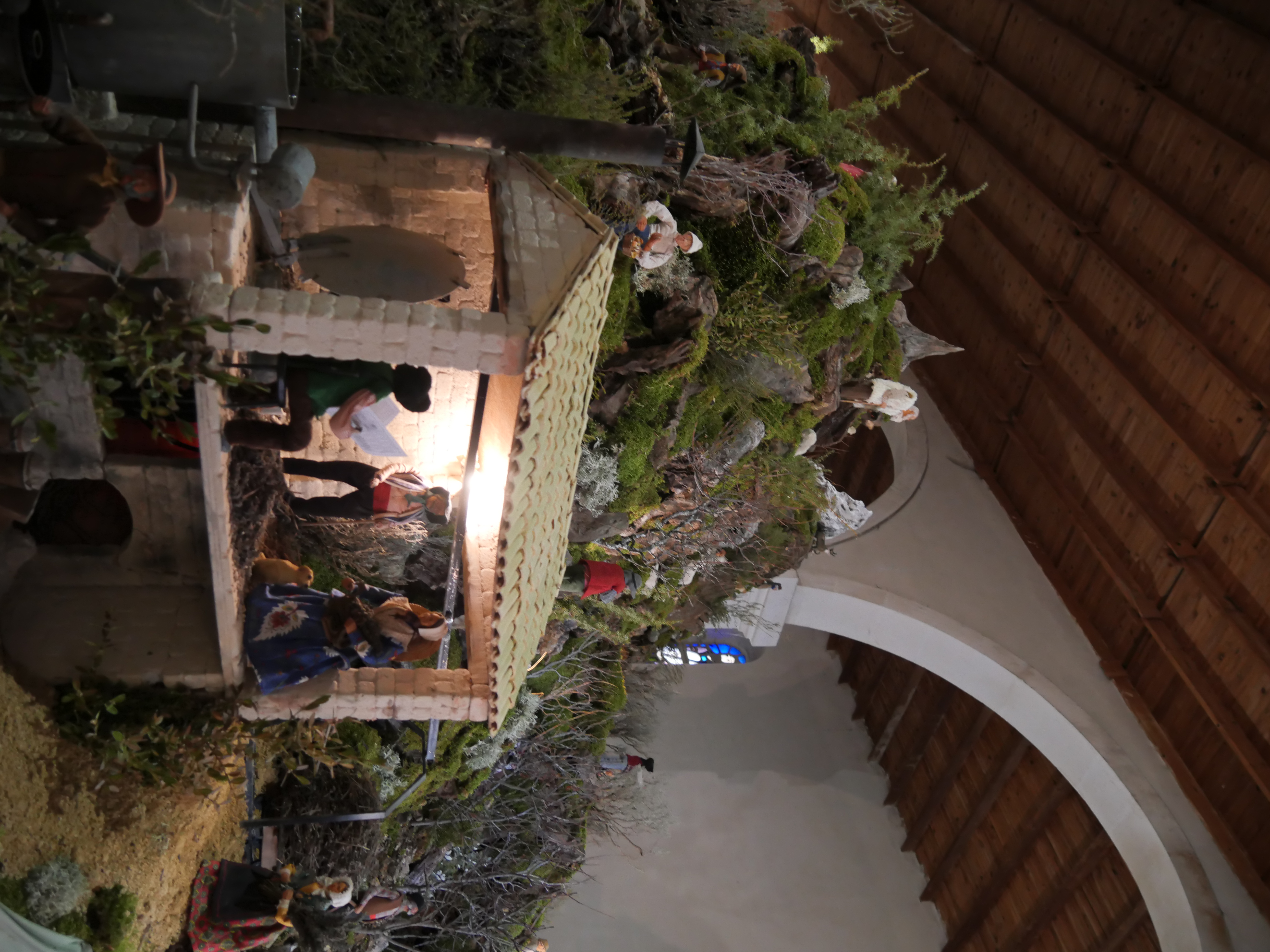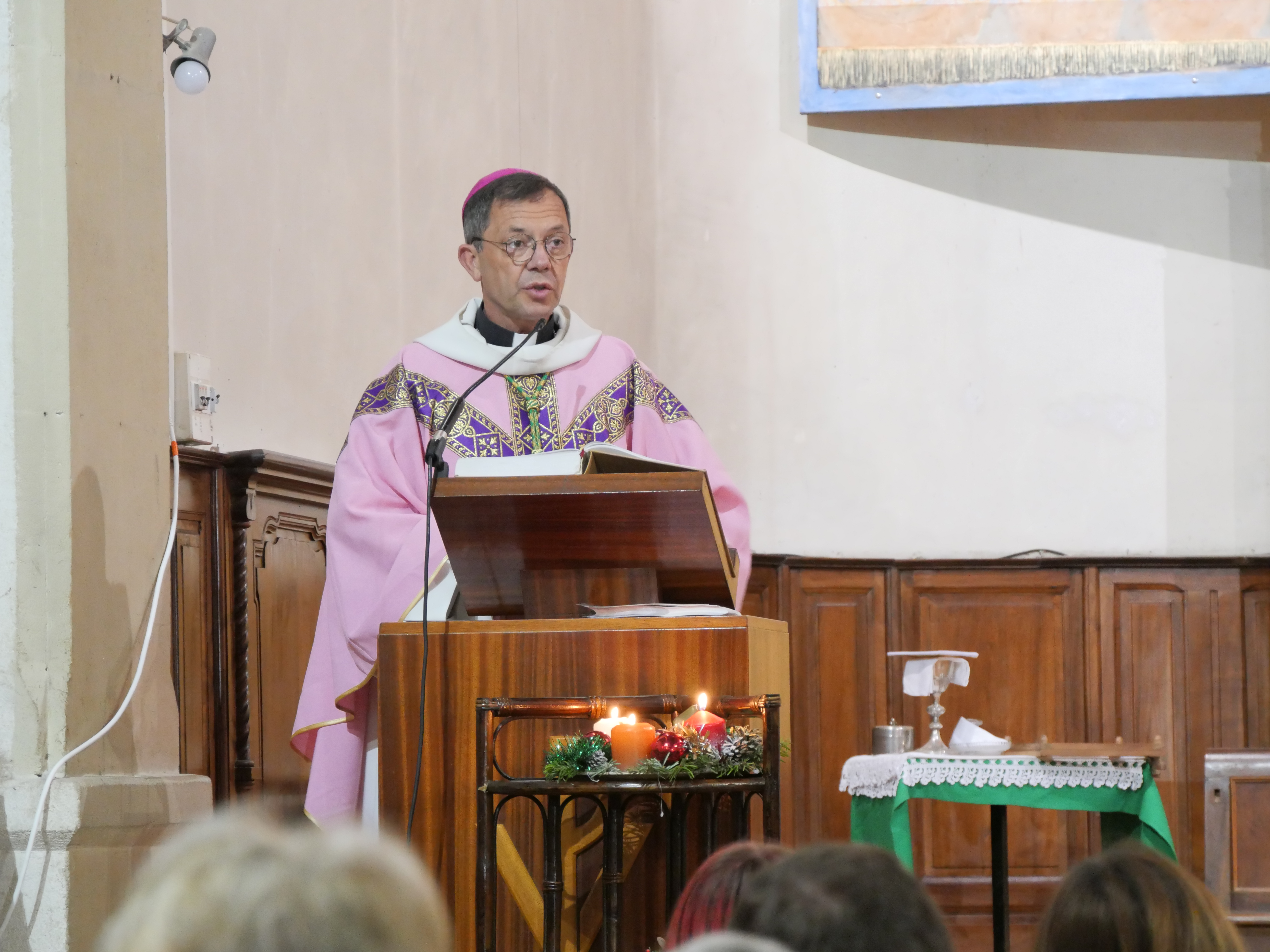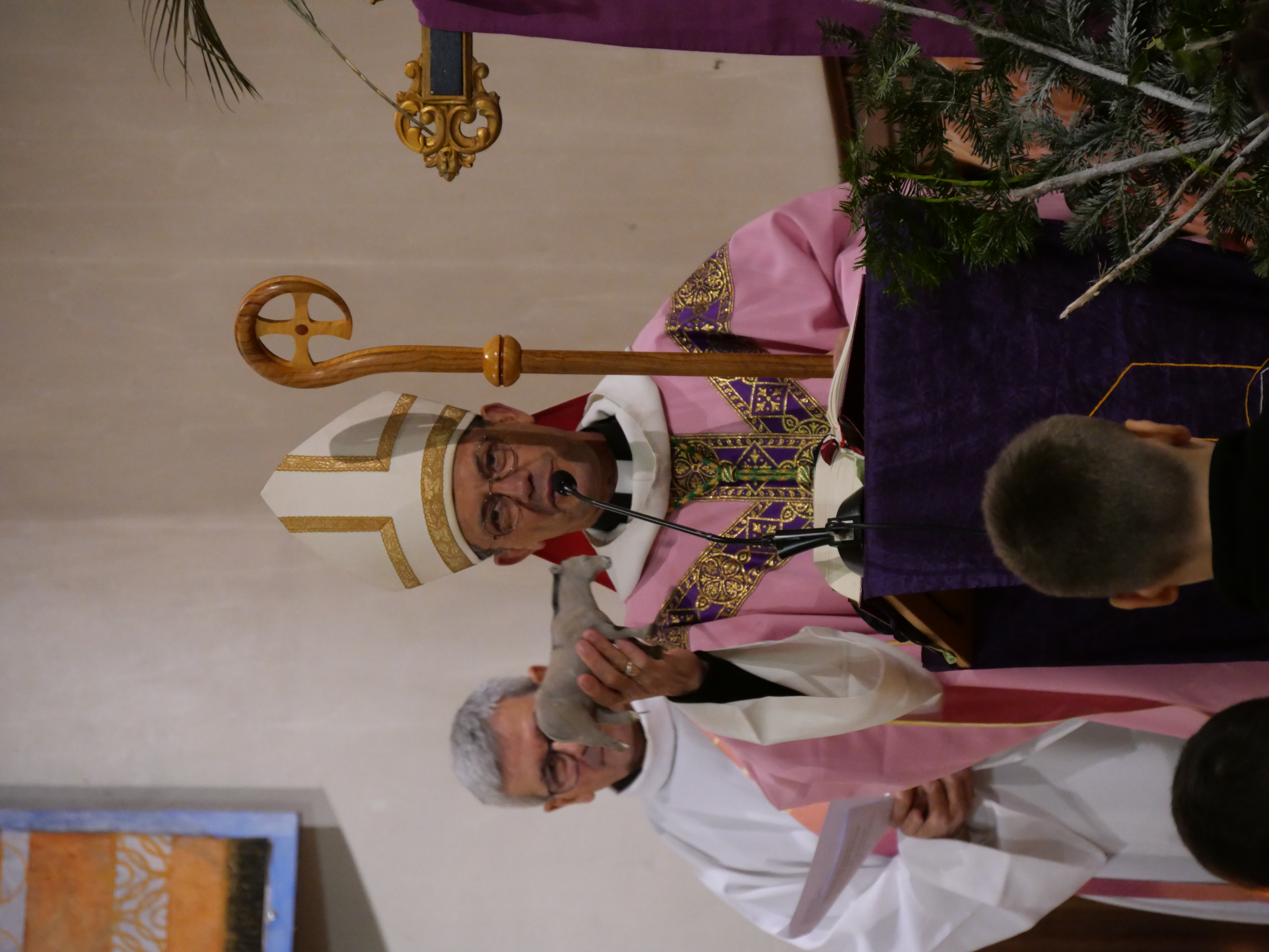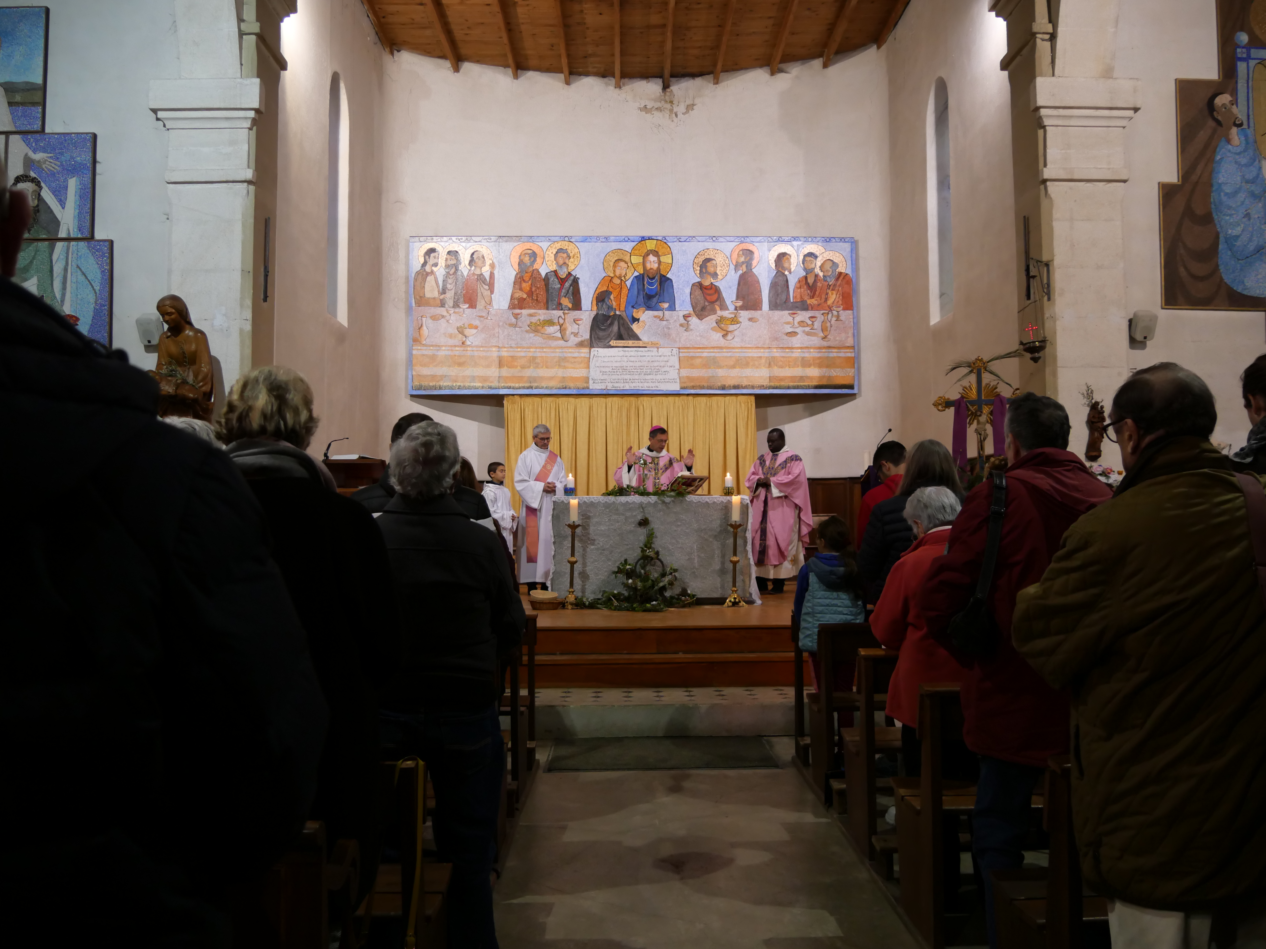 dimanche 14 décembre 2025, inauguration de la crèche de Banon, messe célébrée par Mgr Gobilliard Mgr rencontre Carlos, principal crèchiste.