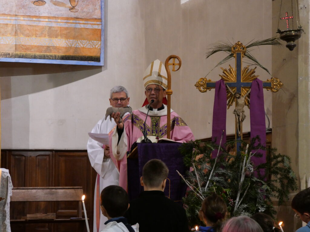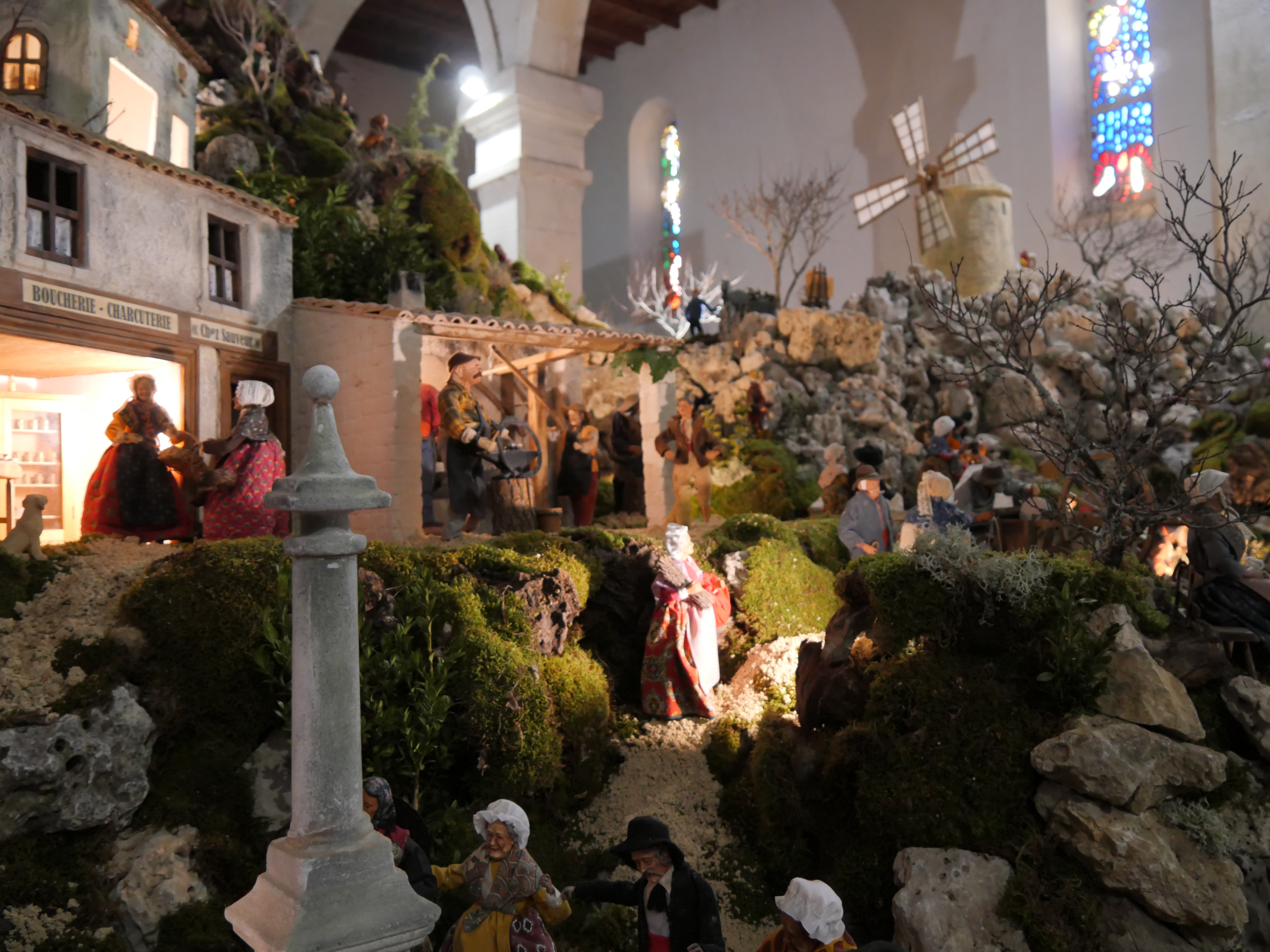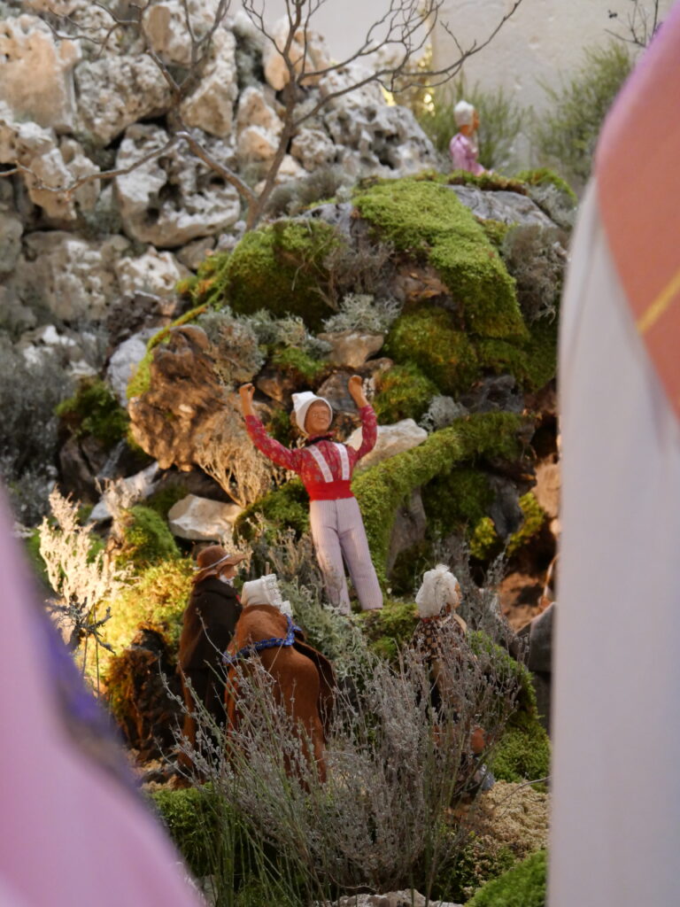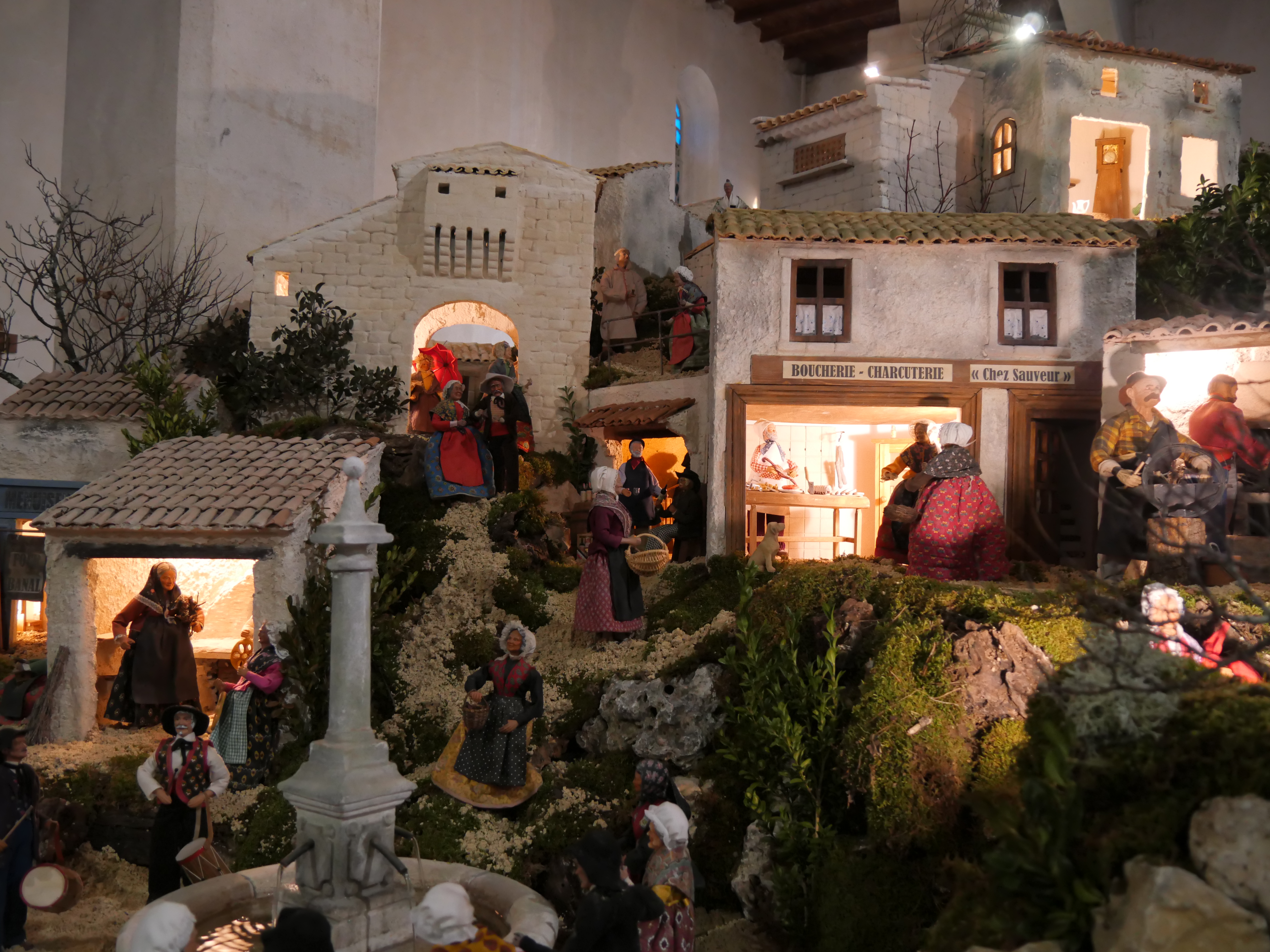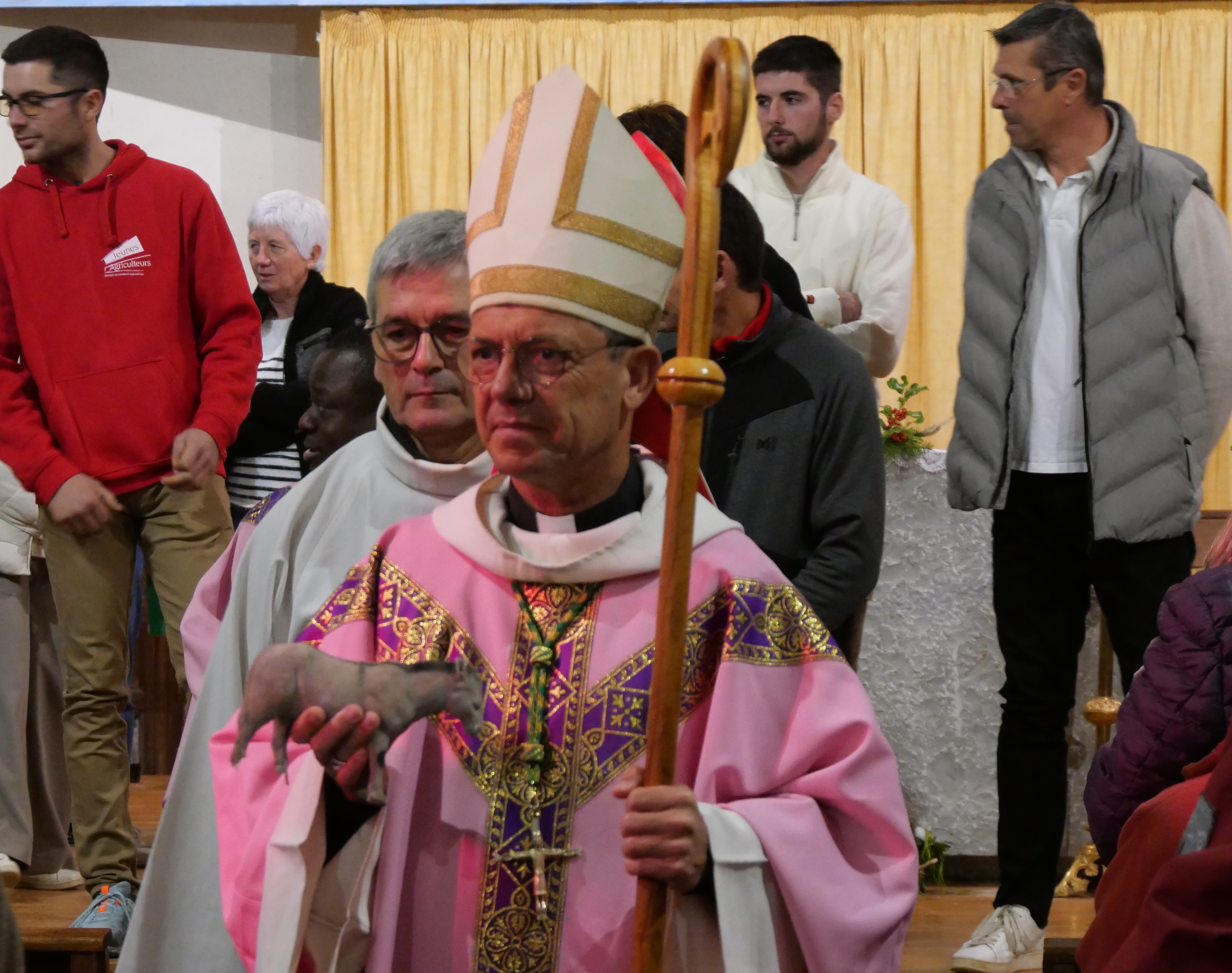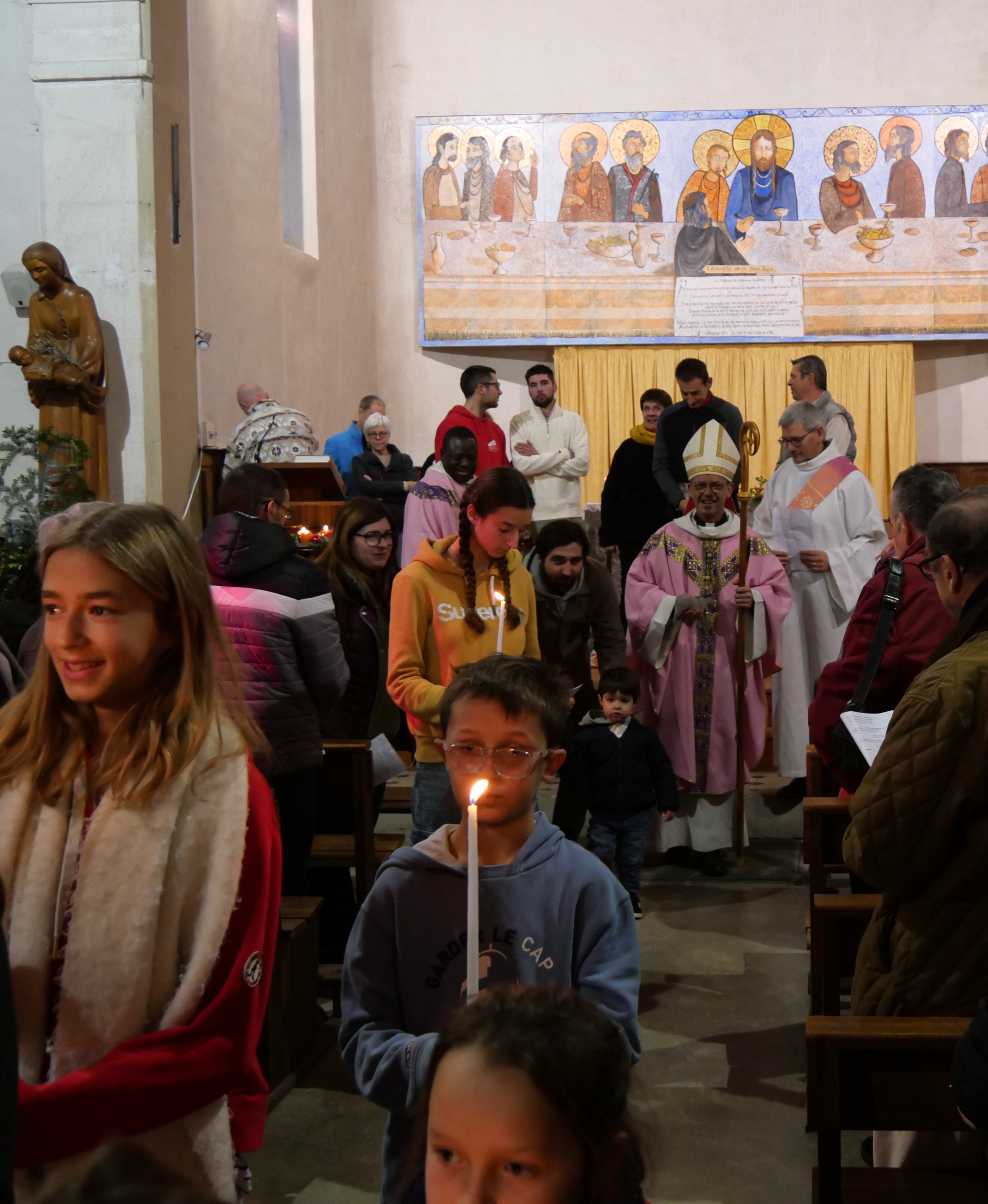 dimanche 14 décembre 2025, inauguration de la crèche de Banon, messe célébrée par Mgr Gobilliard Mgr rencontre Carlos, principal crèchiste.