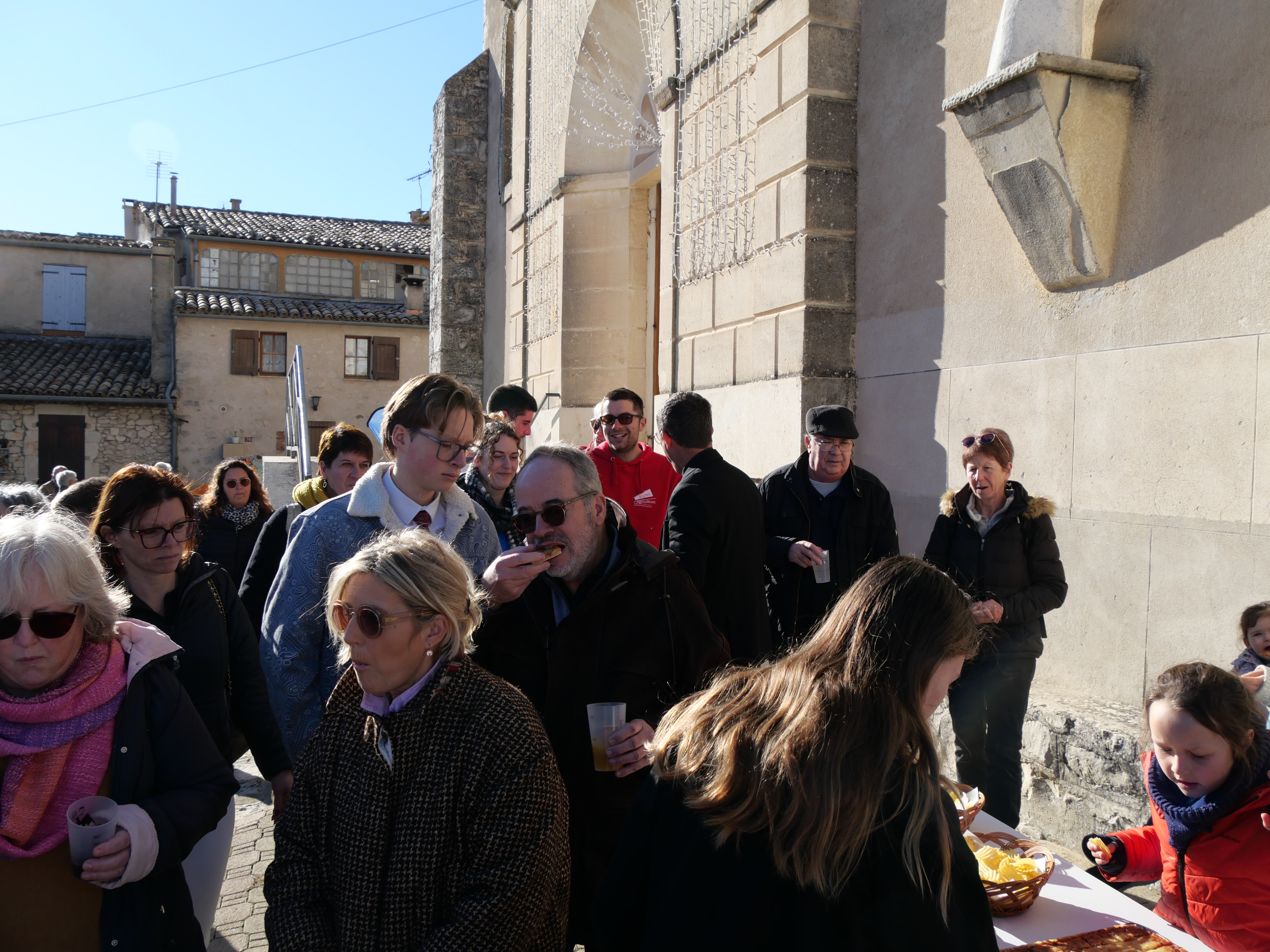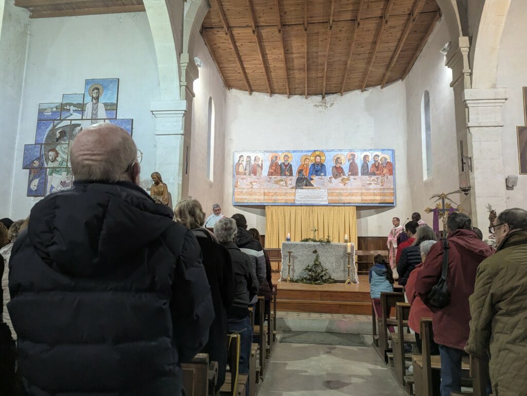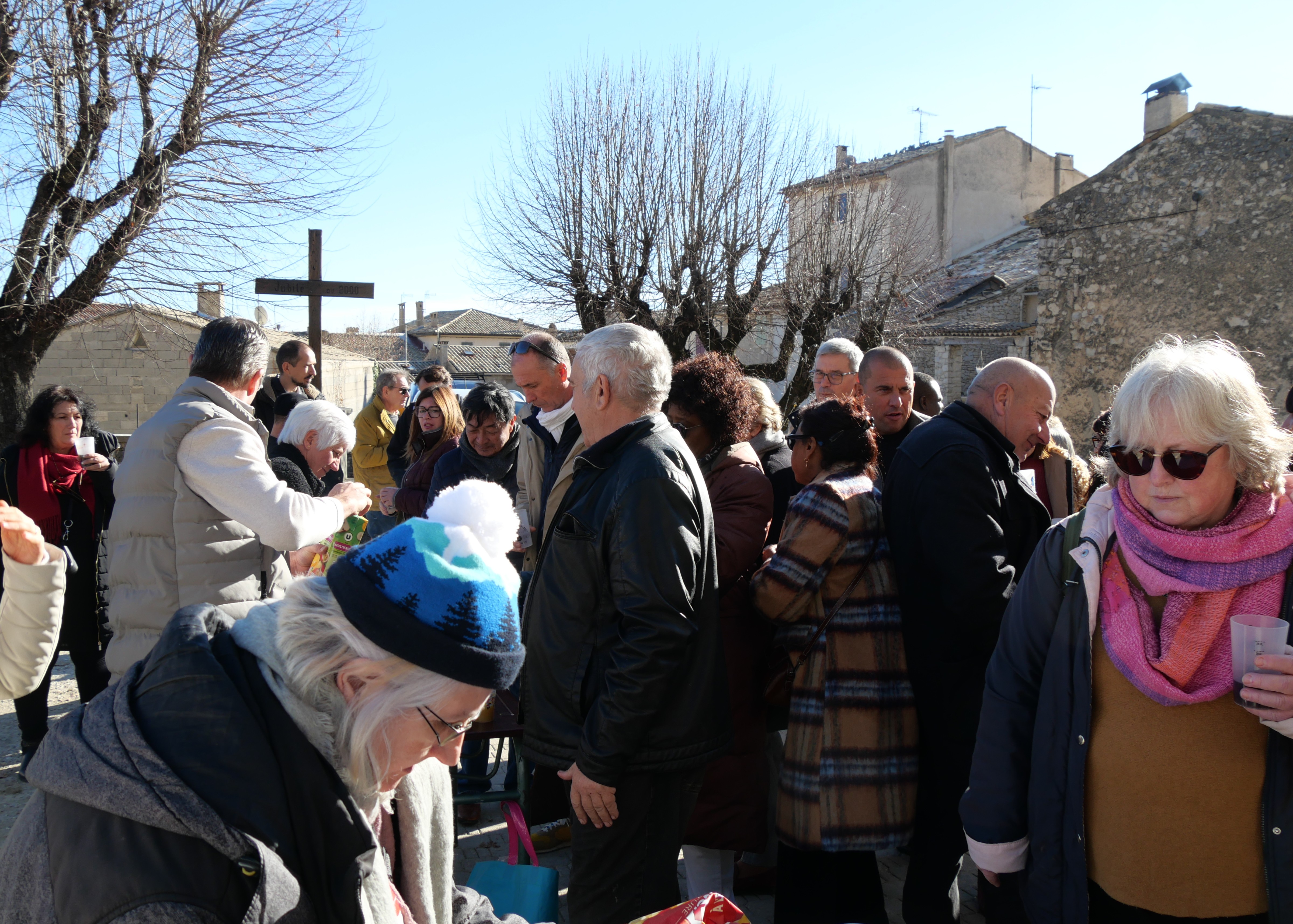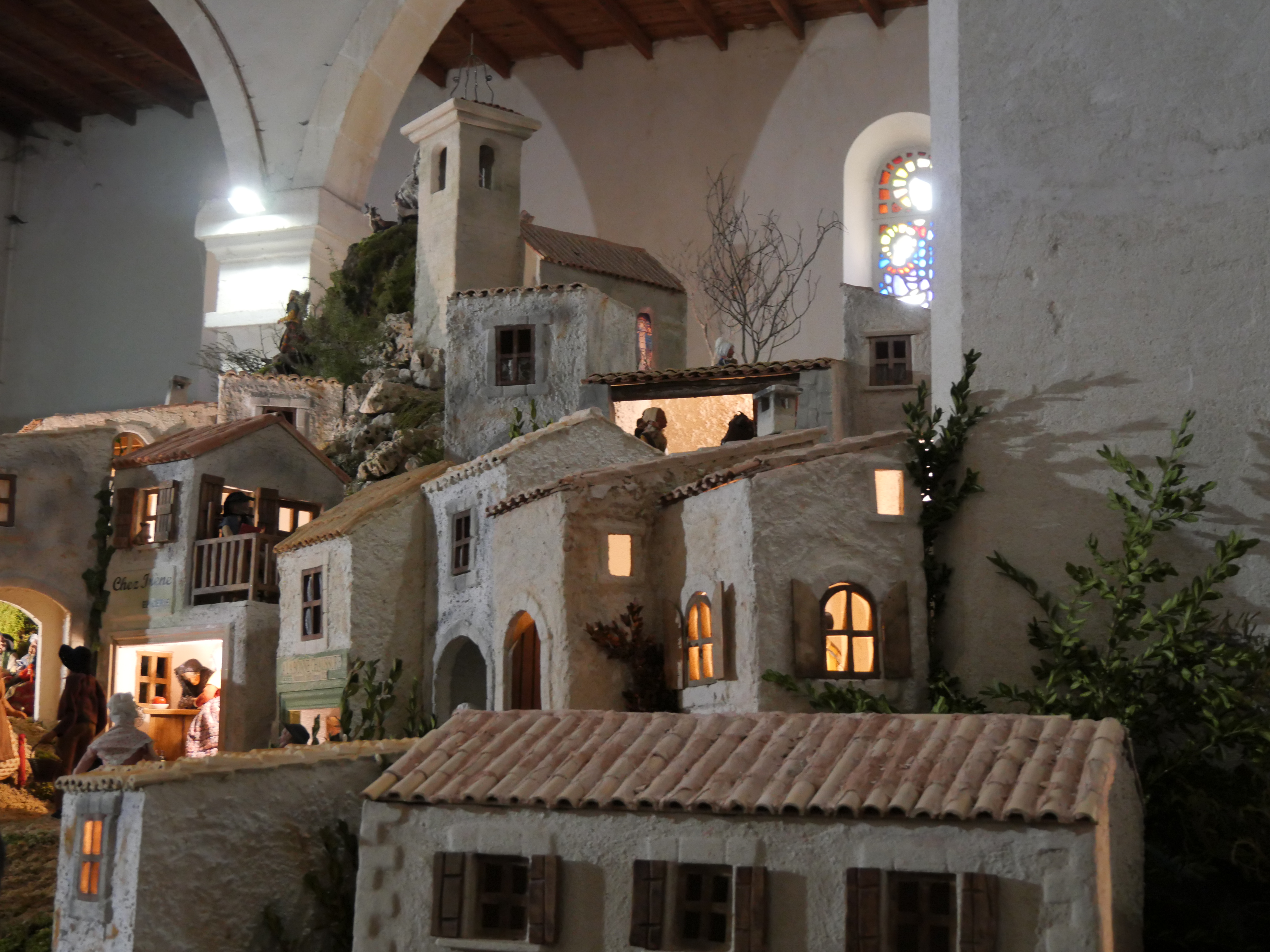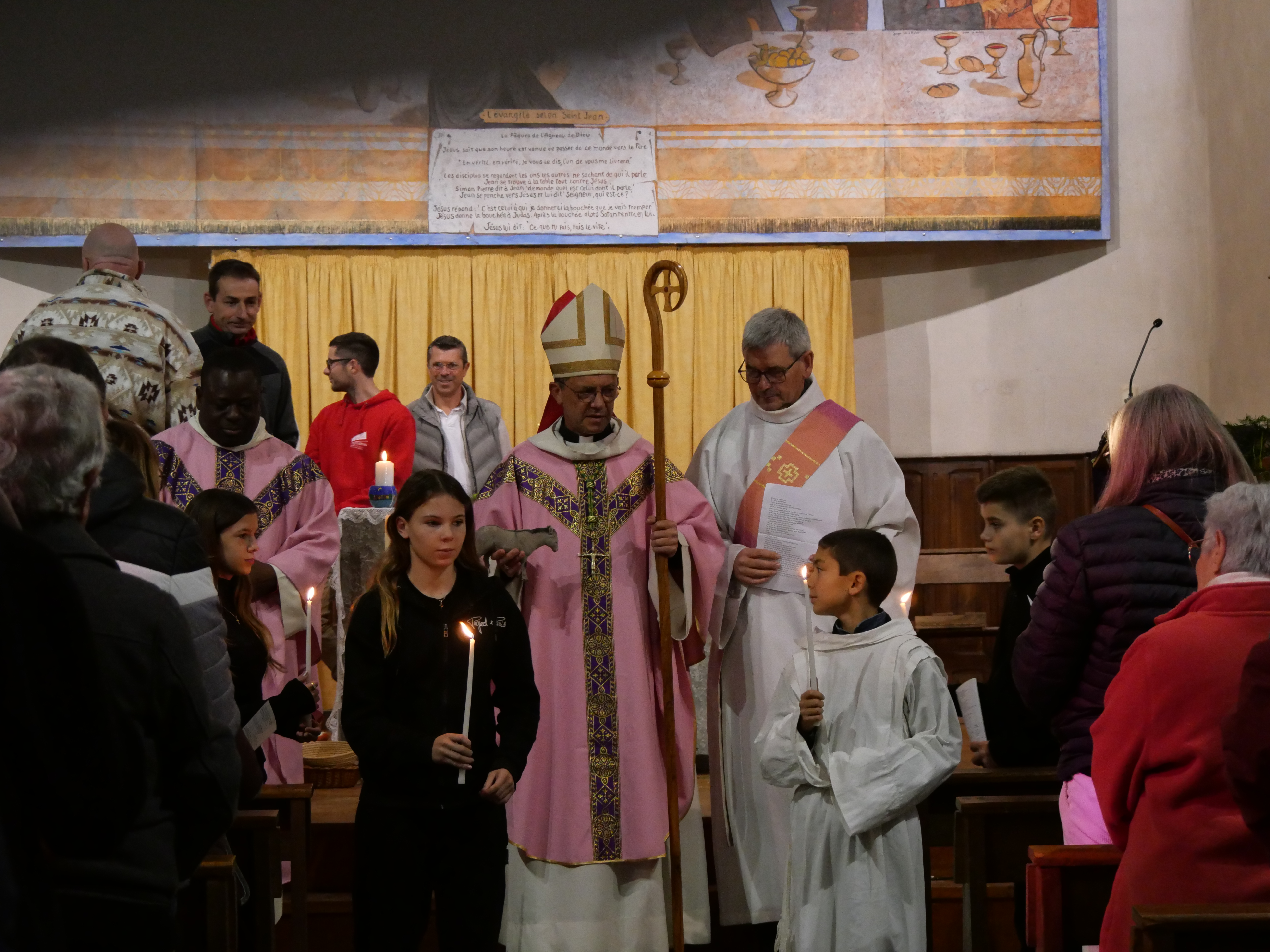 dimanche 14 décembre 2025, inauguration de la crèche de Banon, messe célébrée par Mgr Gobilliard Mgr rencontre Carlos, principal crèchiste.