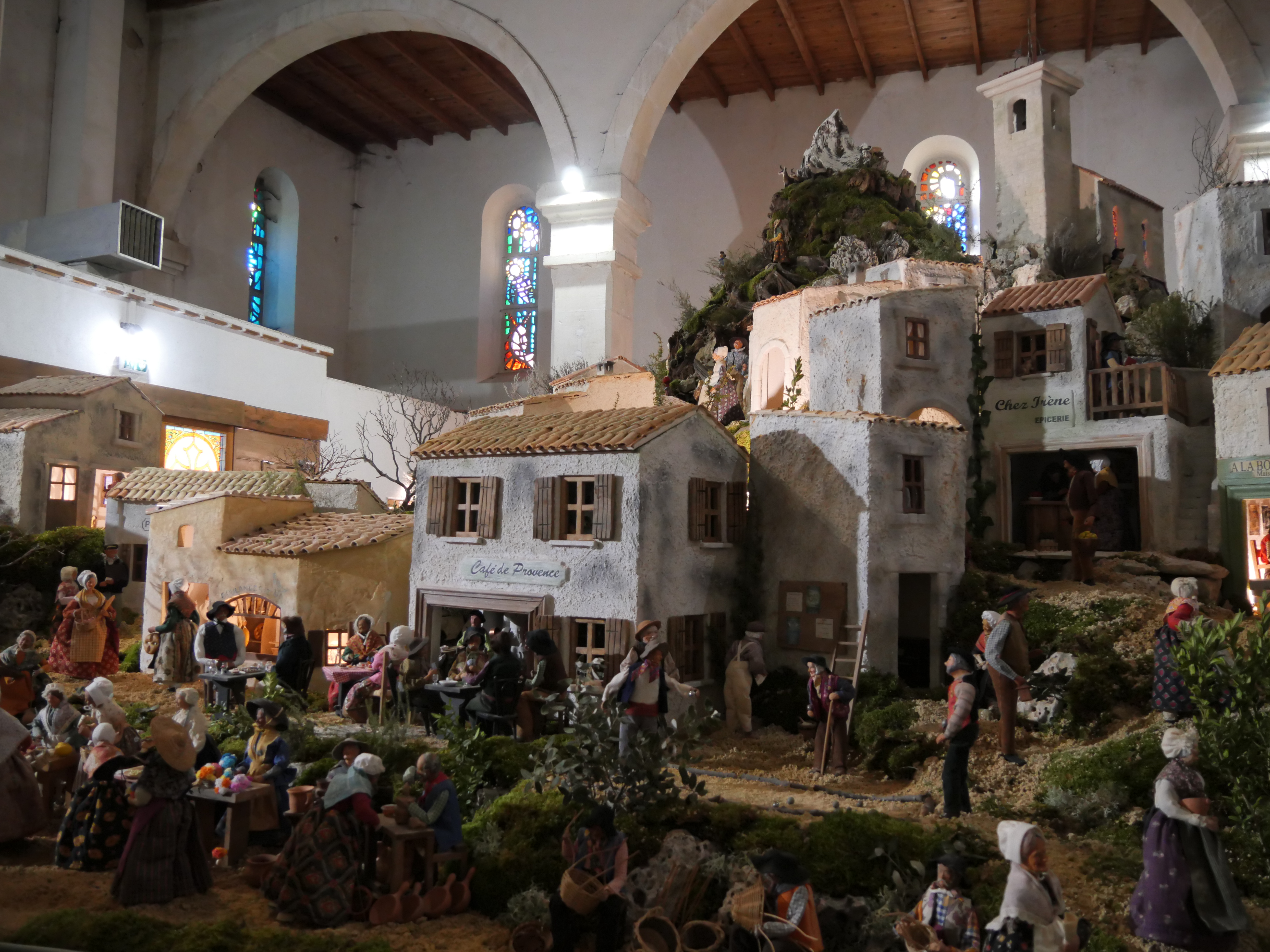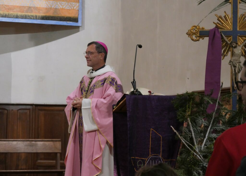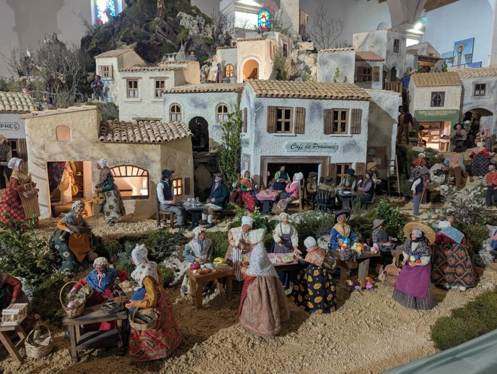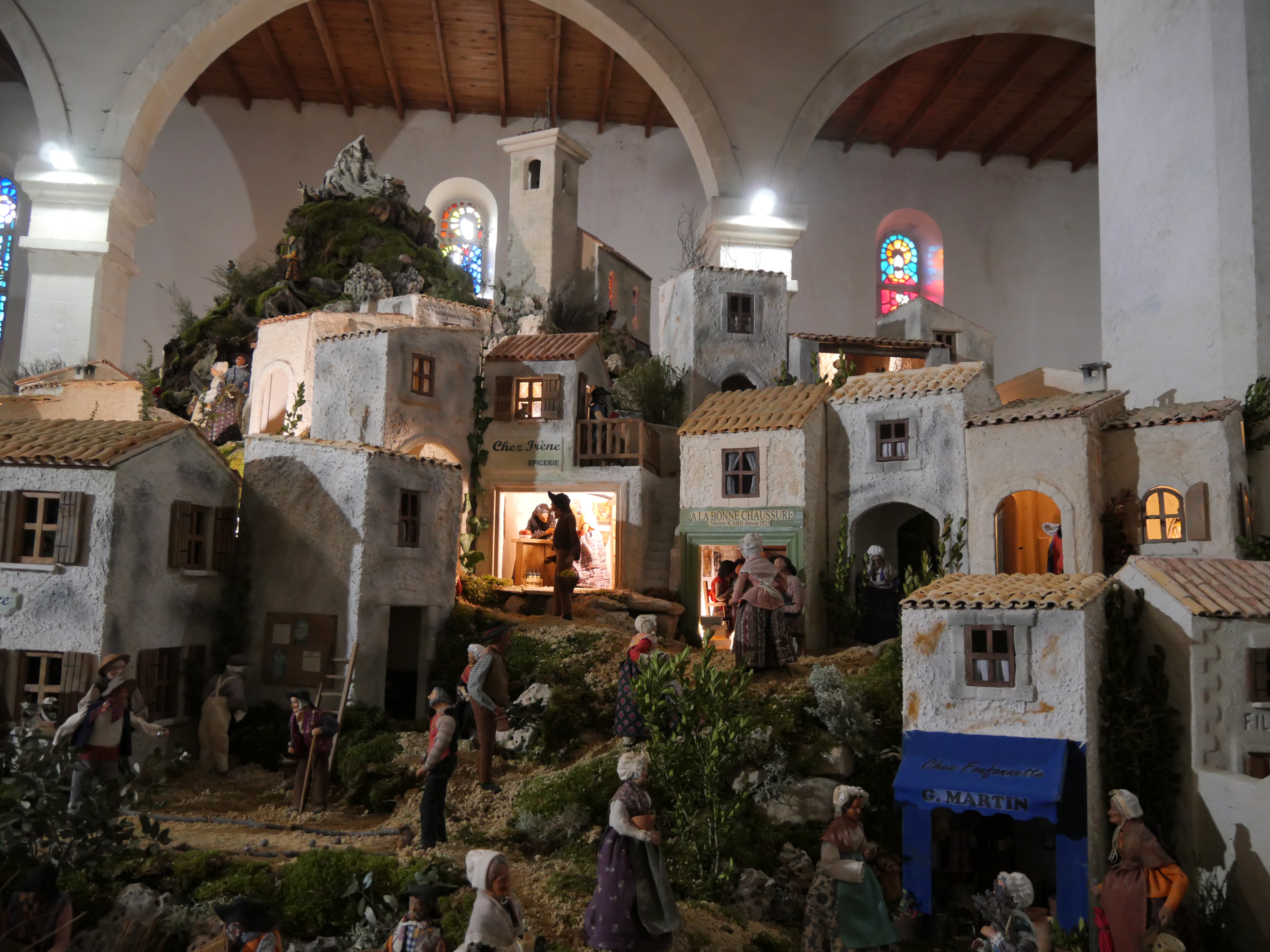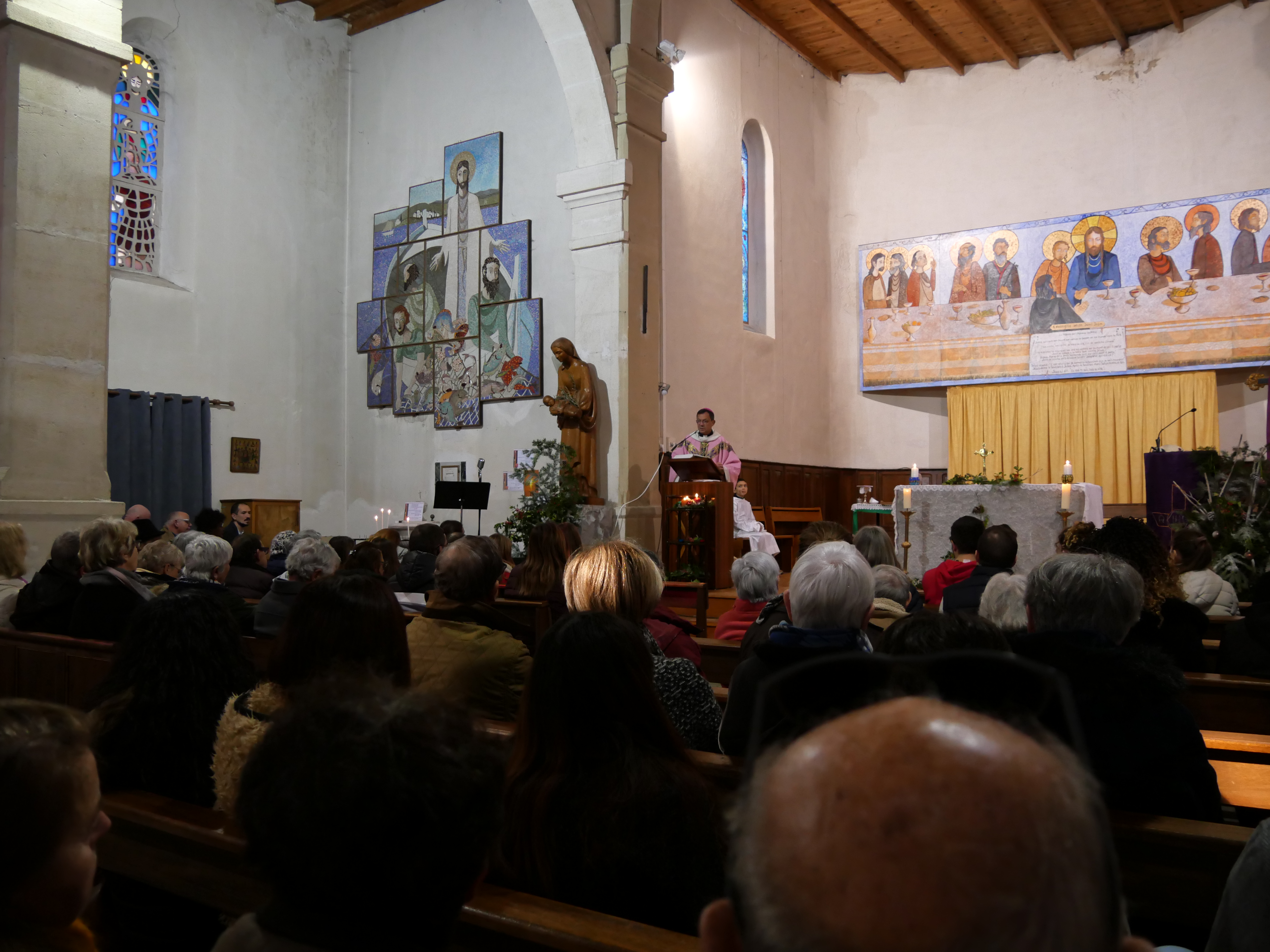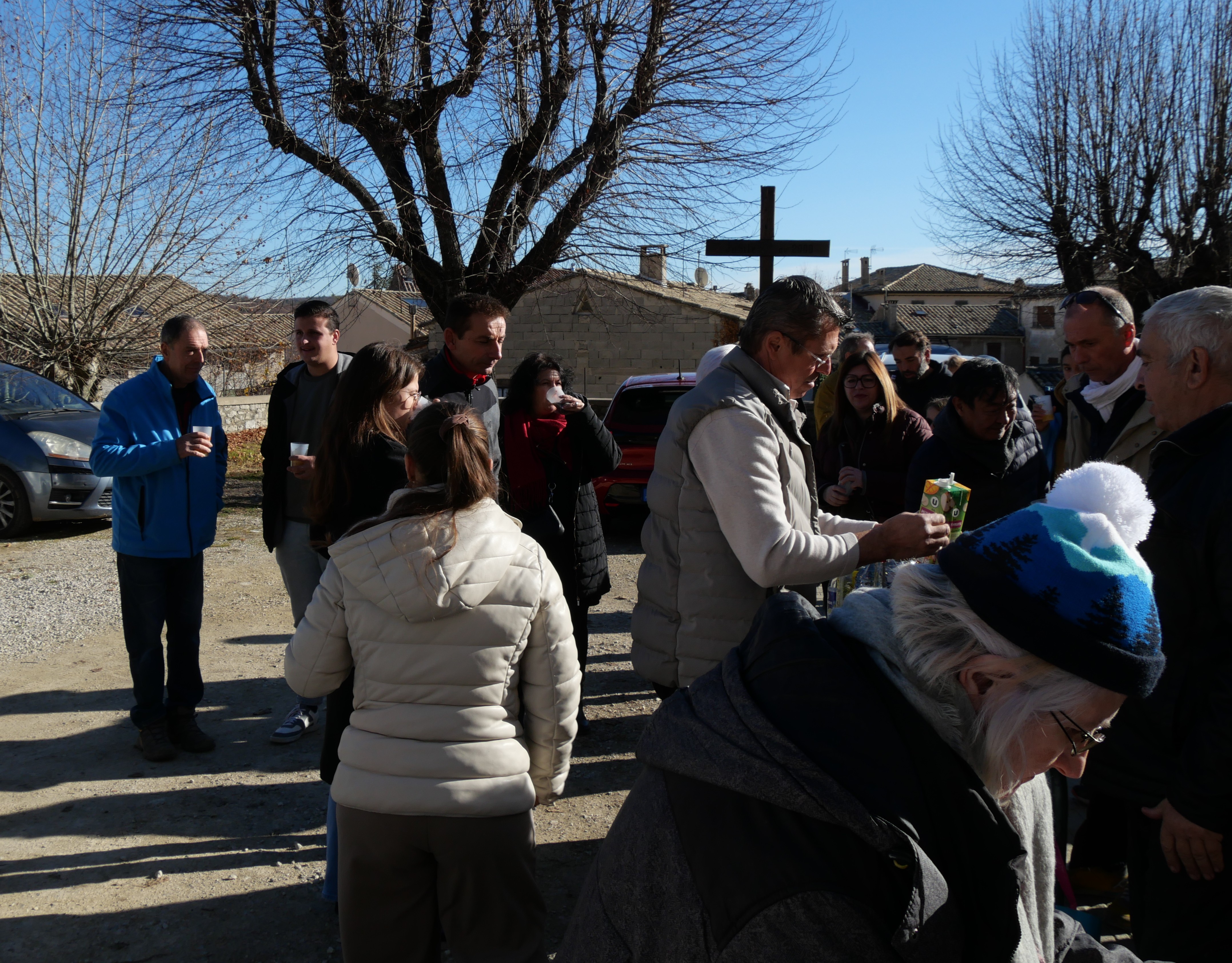 dimanche 14 décembre 2025, inauguration de la crèche de Banon, messe célébrée par Mgr Gobilliard Mgr rencontre Carlos, principal crèchiste.