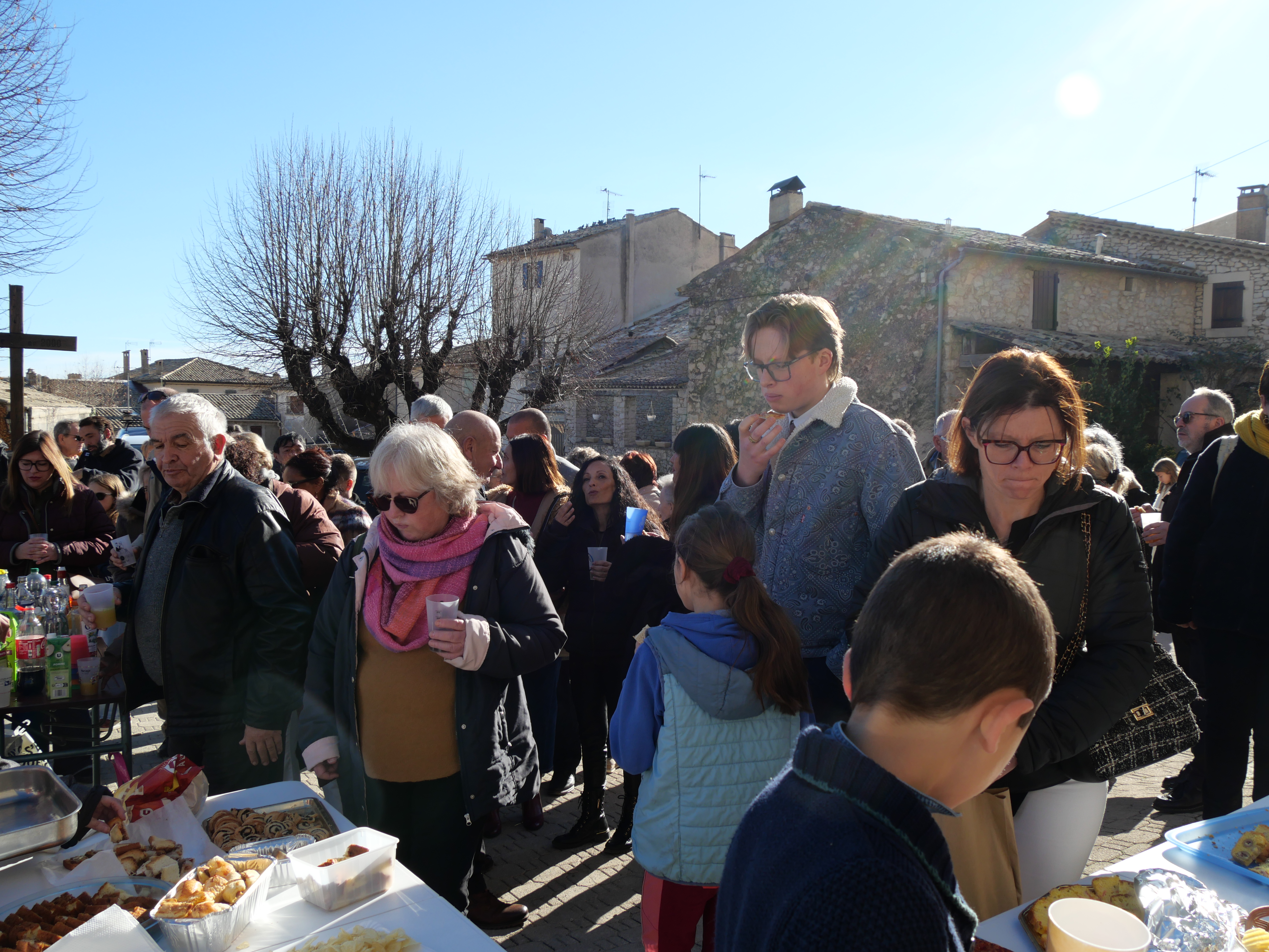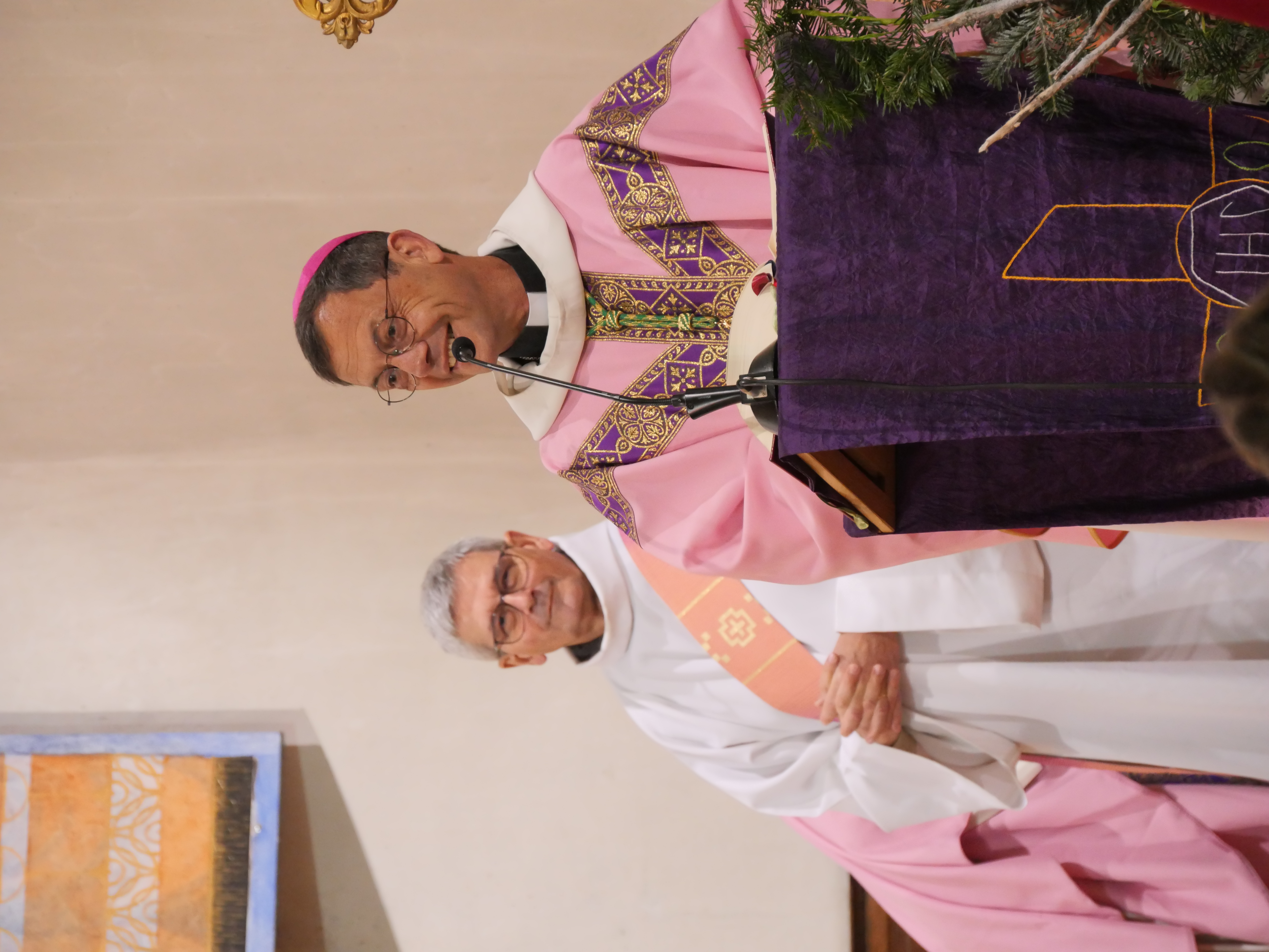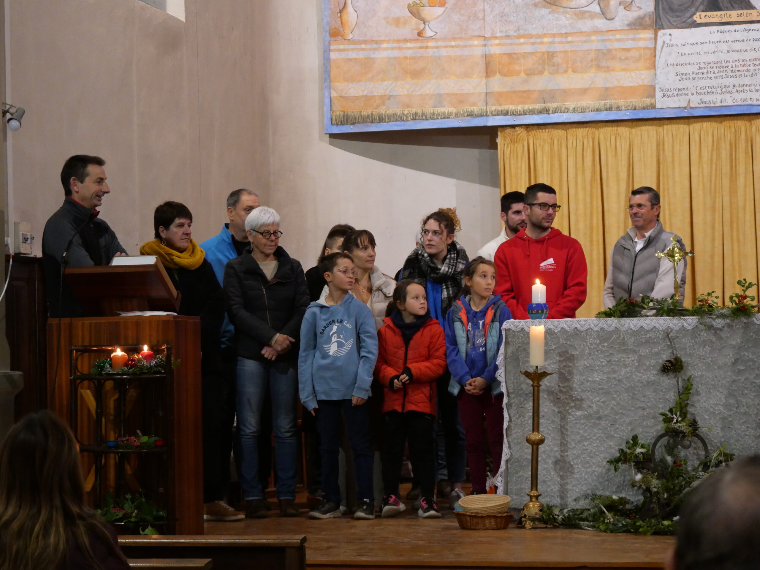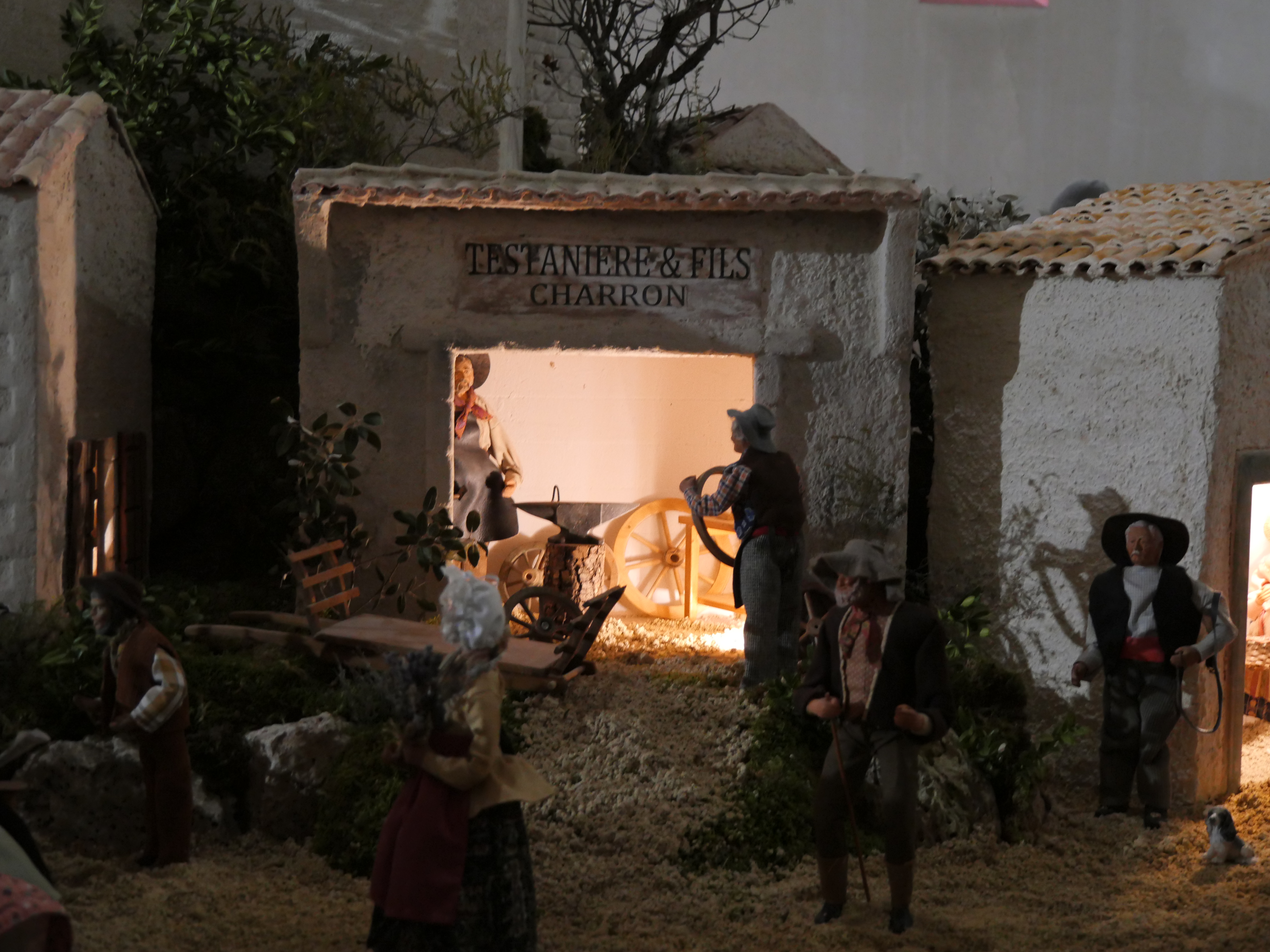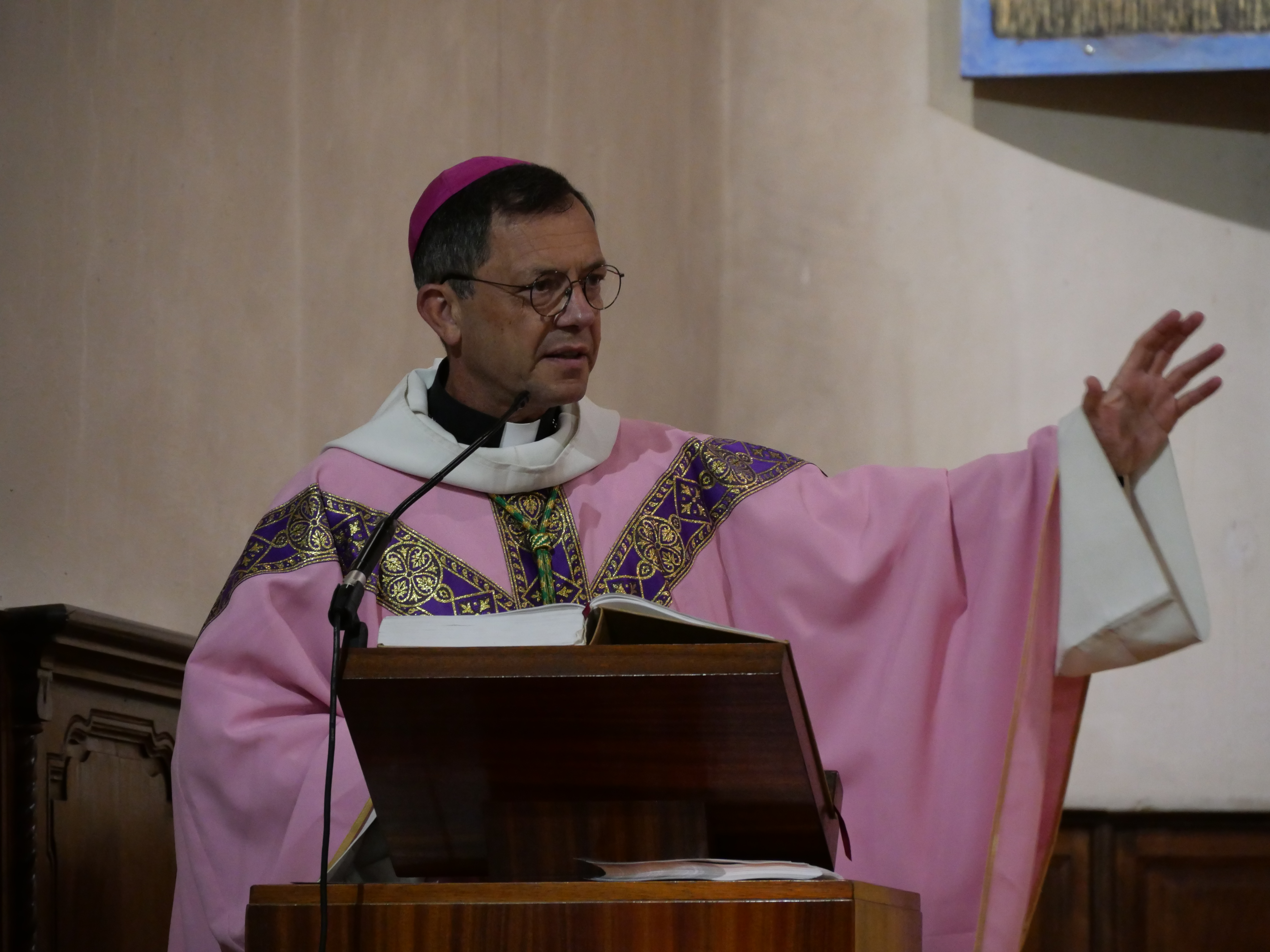 dimanche 14 décembre 2025, inauguration de la crèche de Banon, messe célébrée par Mgr Gobilliard Mgr rencontre Carlos, principal crèchiste.