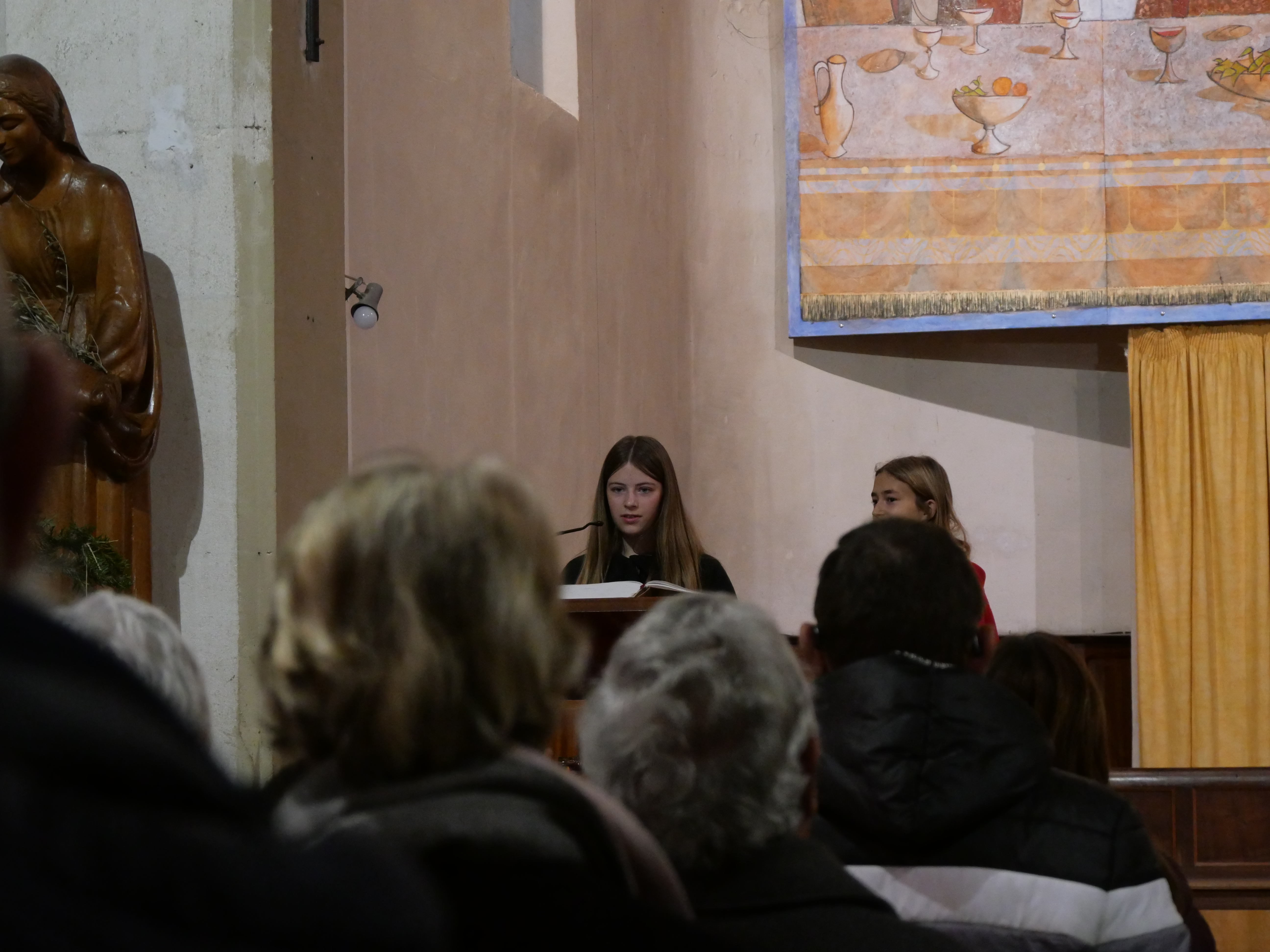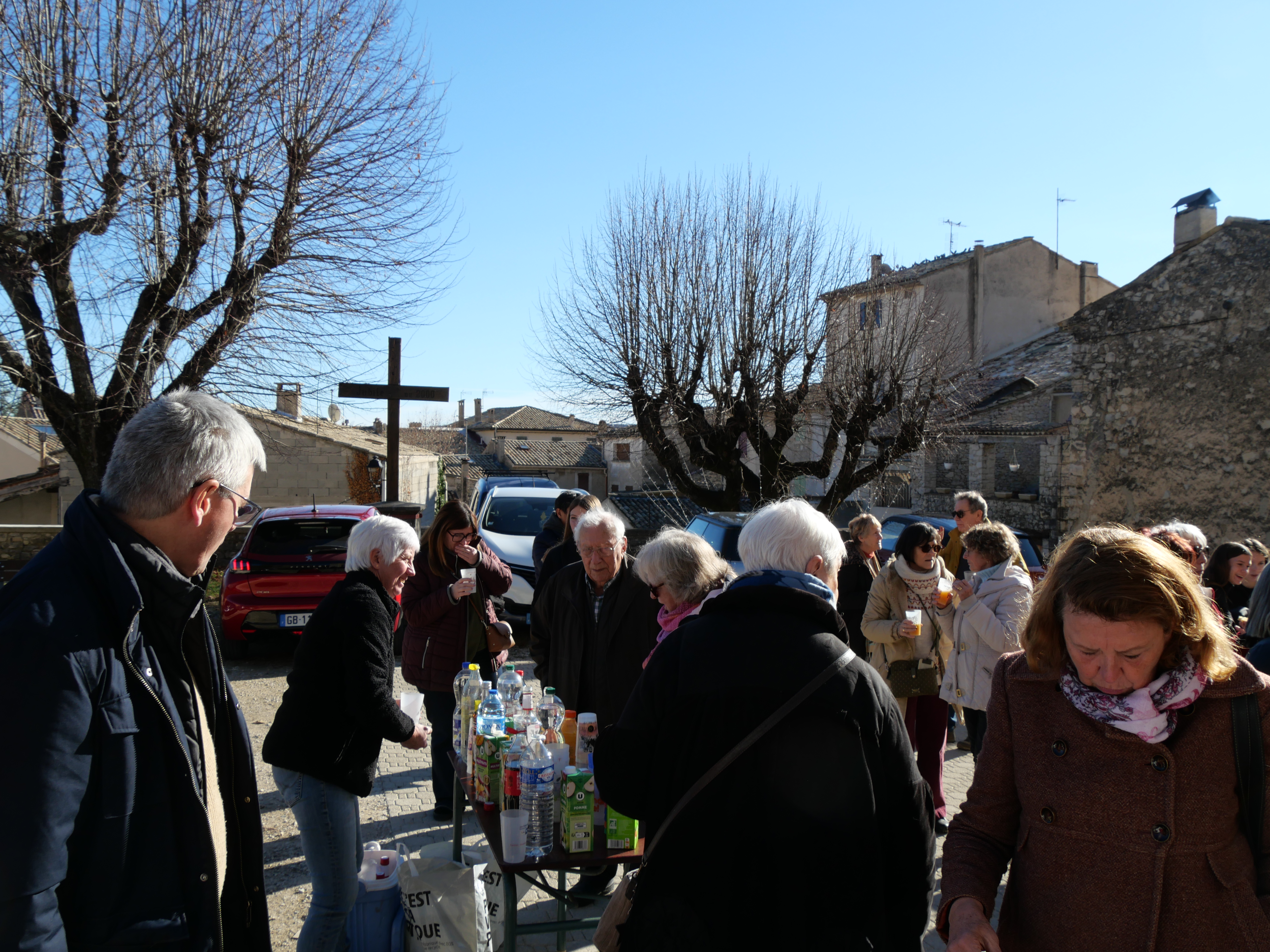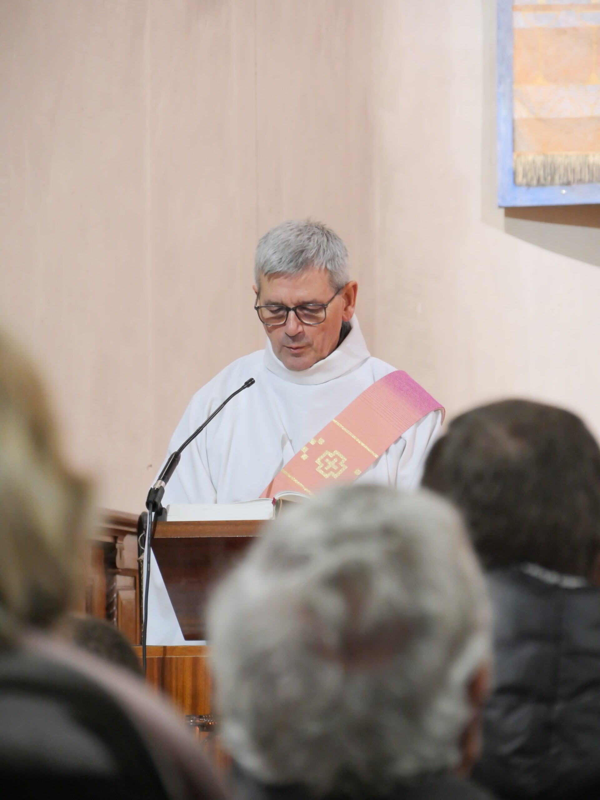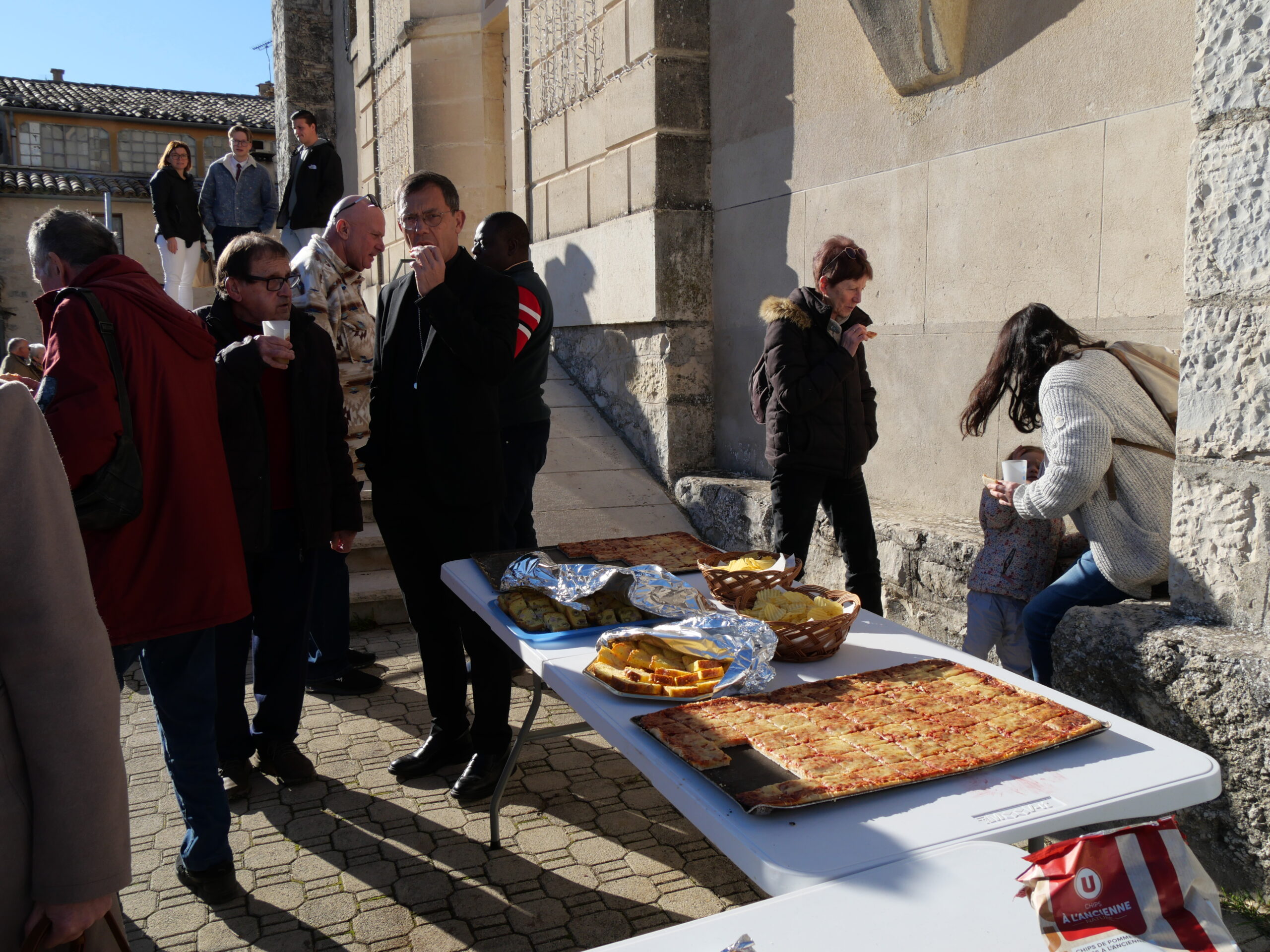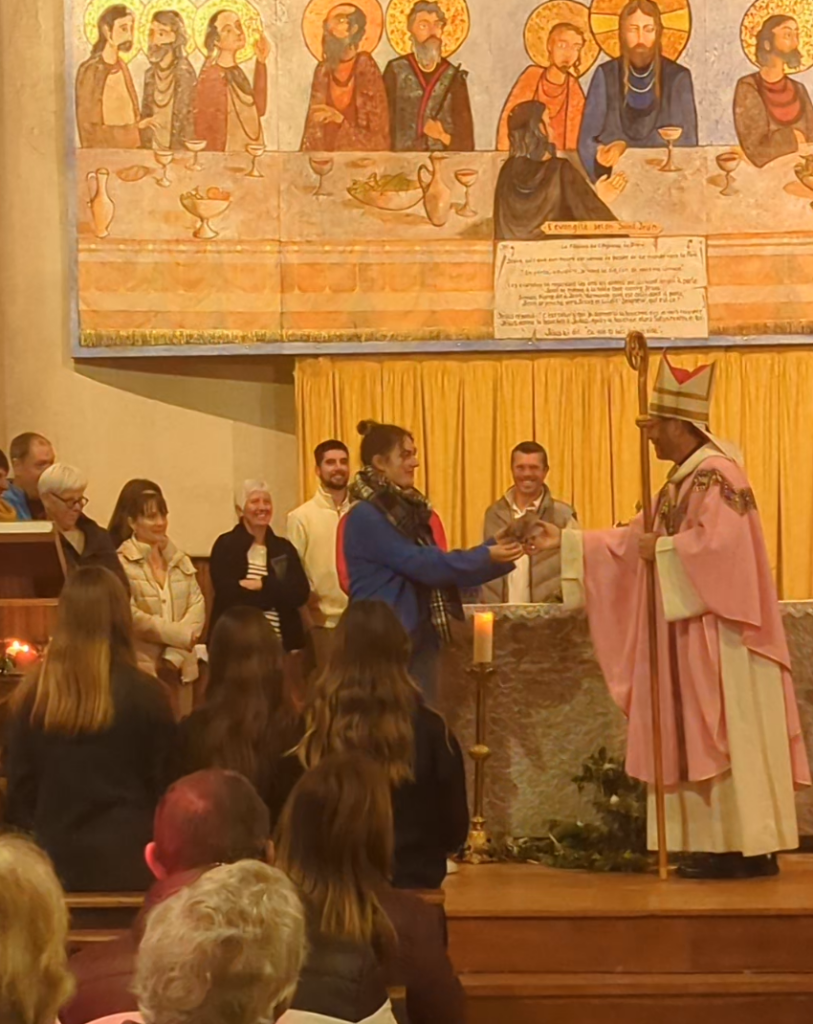 dimanche 14 décembre 2025, inauguration de la crèche de Banon, messe célébrée par Mgr Gobilliard Mgr rencontre Carlos, principal crèchiste.