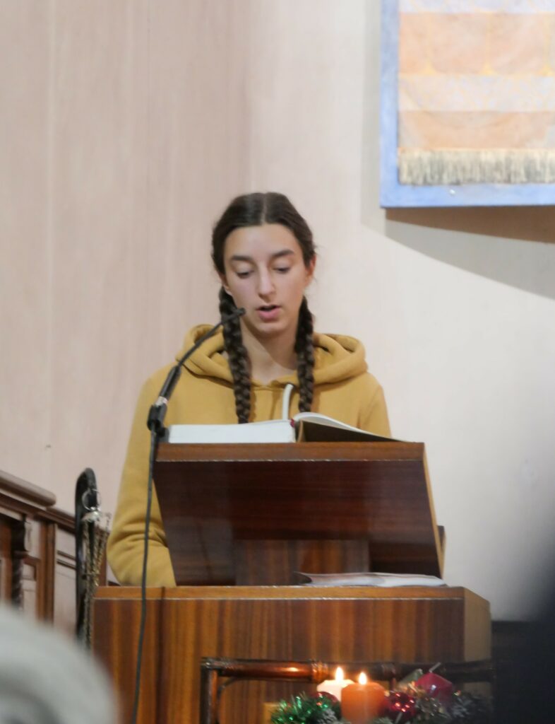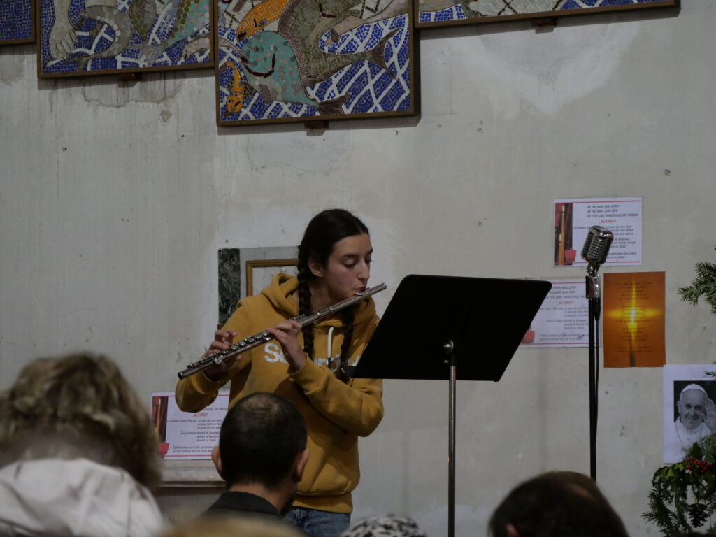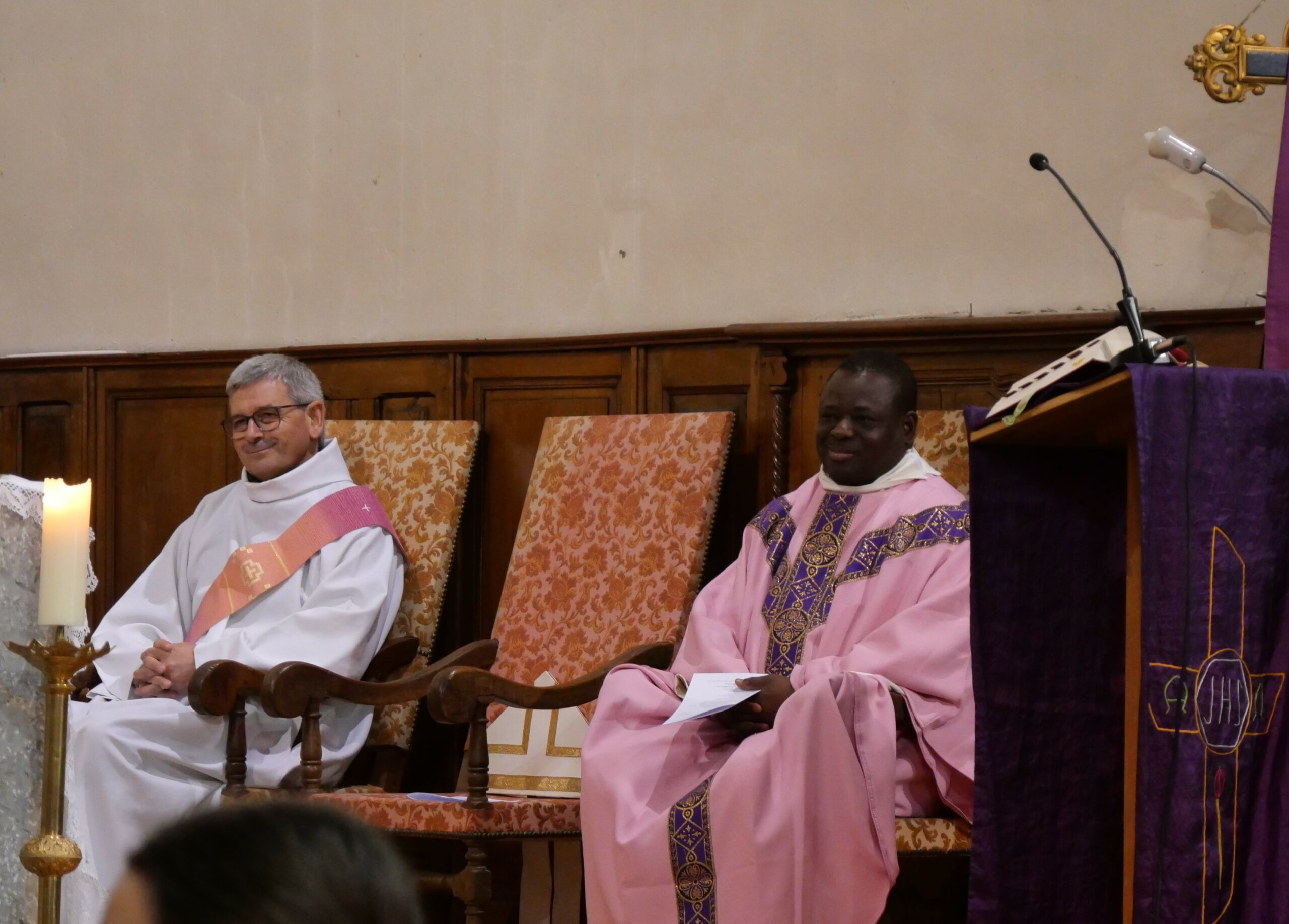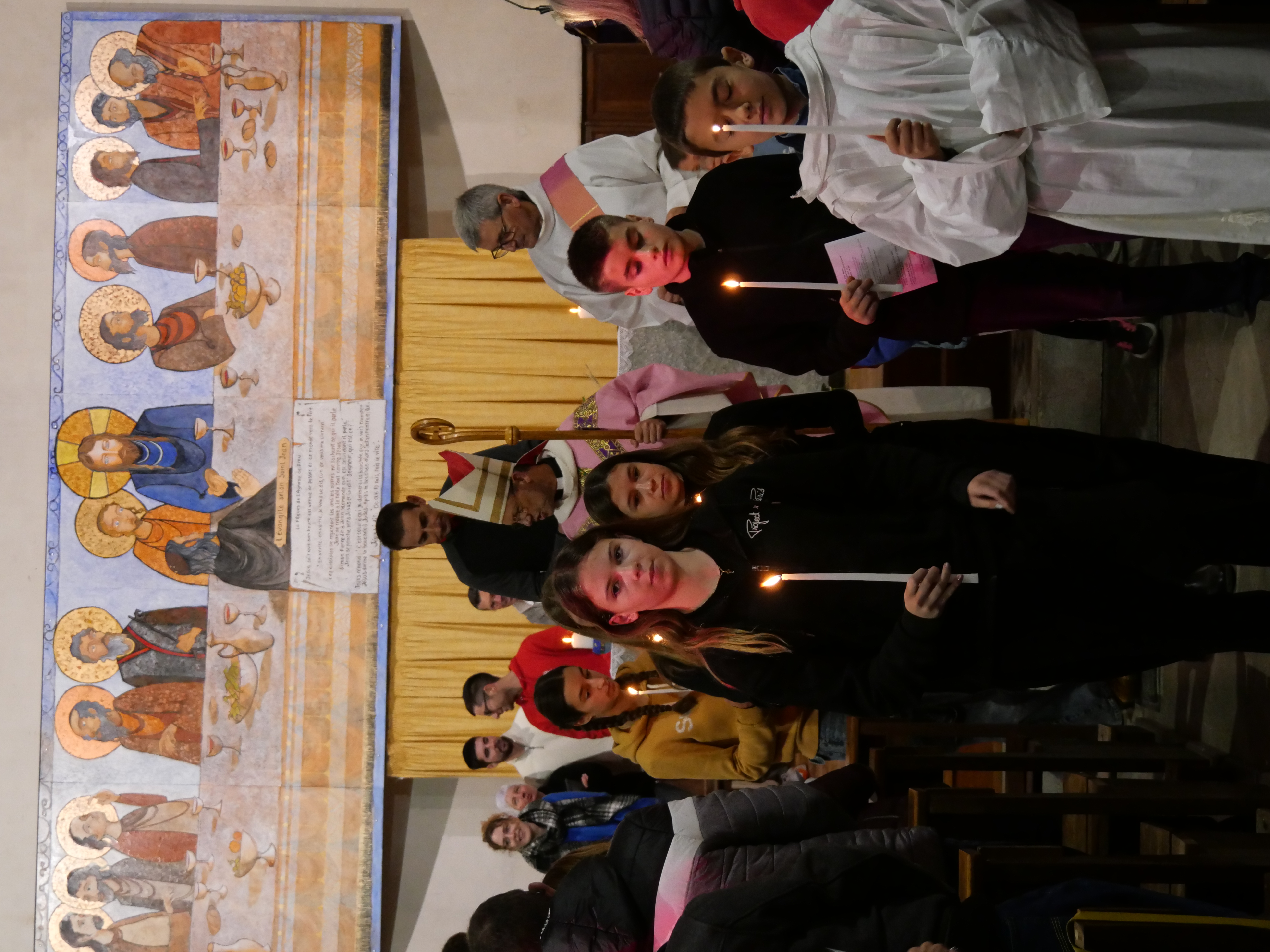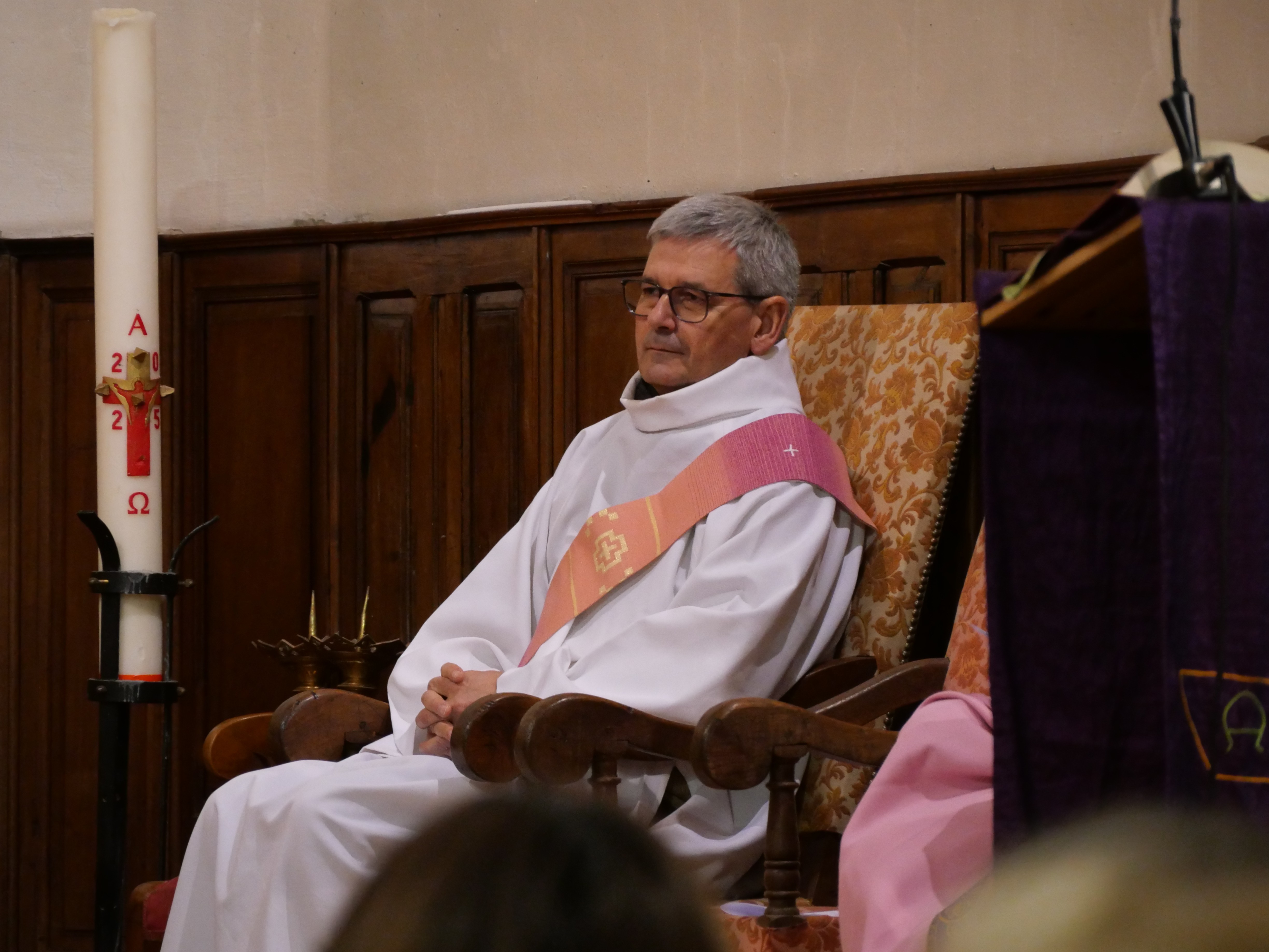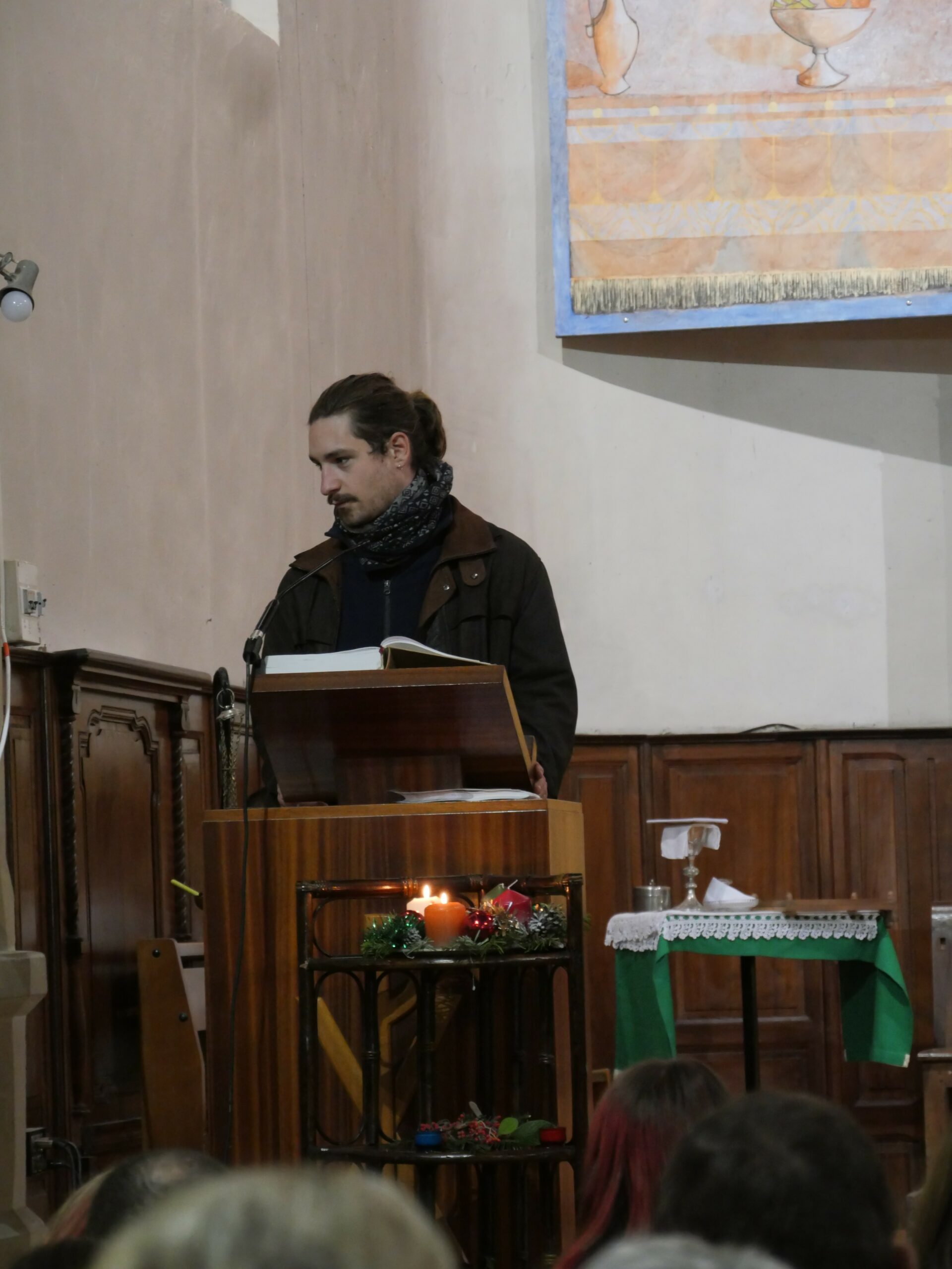 dimanche 14 décembre 2025, inauguration de la crèche de Banon, messe célébrée par Mgr Gobilliard Mgr rencontre Carlos, principal crèchiste.